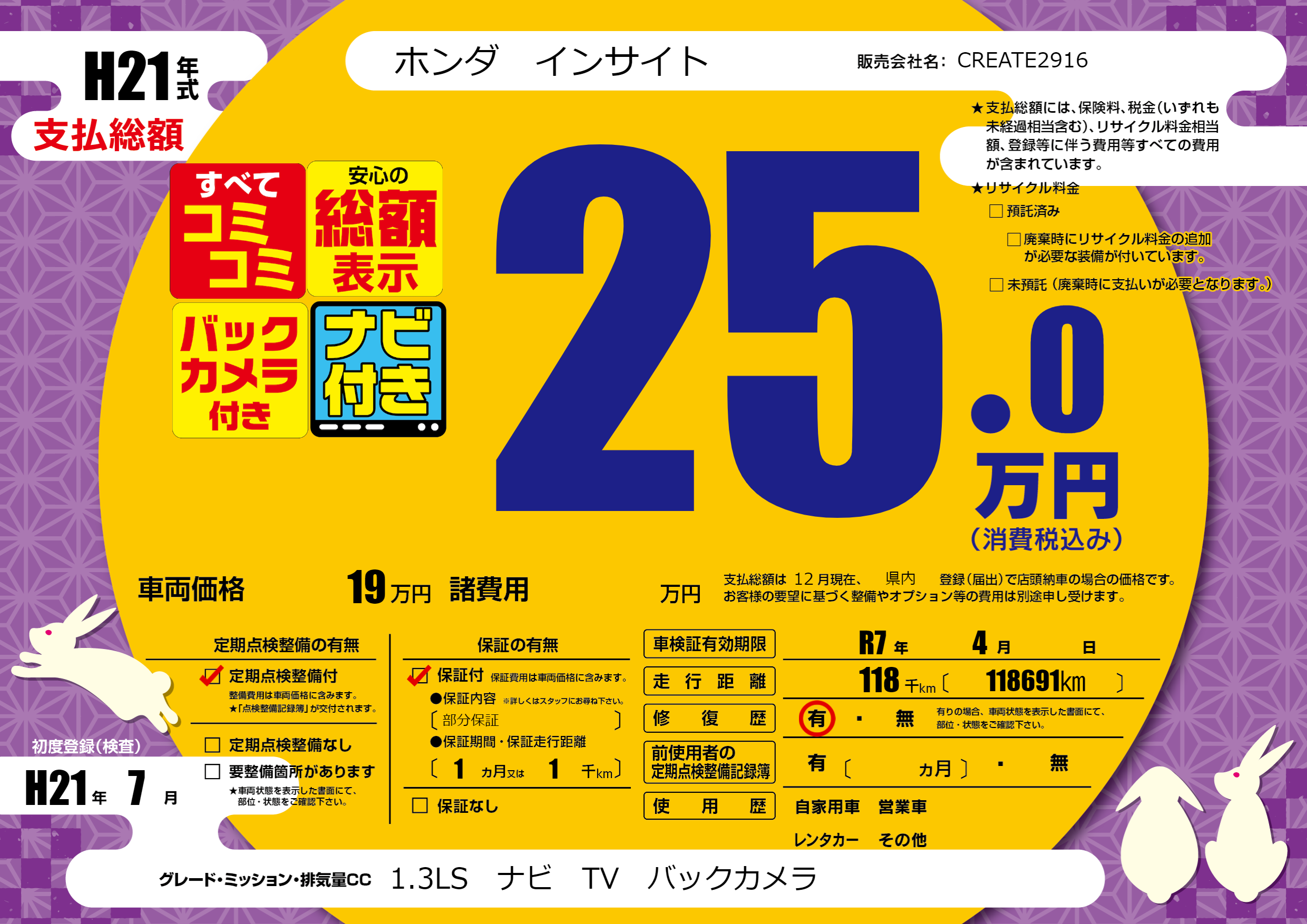 | 車名 | ホンダ インサイト | グレード ミッション 排気量 |