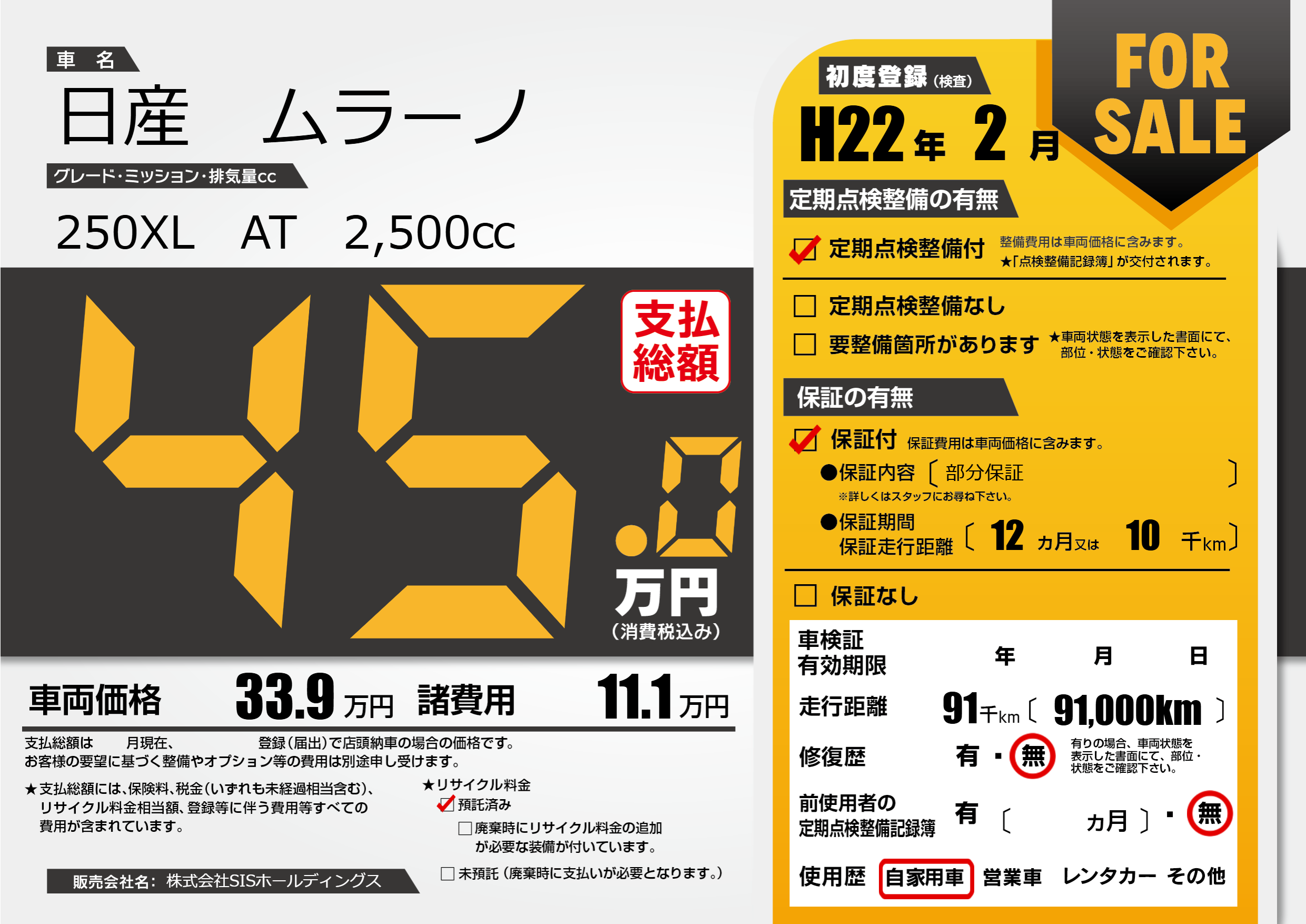 | 車名 | 日産 ムラーノ | グレード ミッション 排気量 |