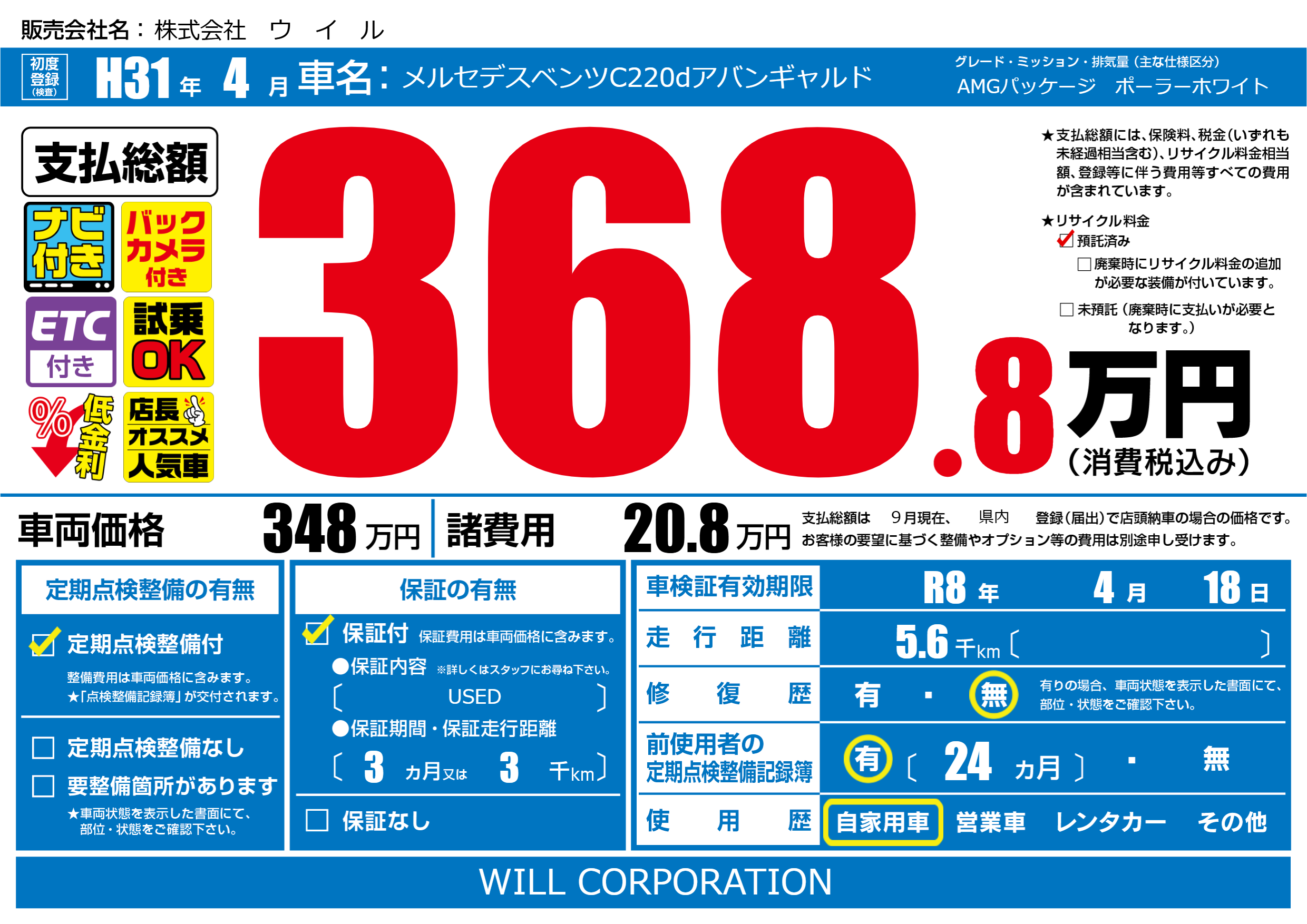 | 車名 | メルセデスベンツC220dアバンギャルド | グレード ミッション 排気量 |