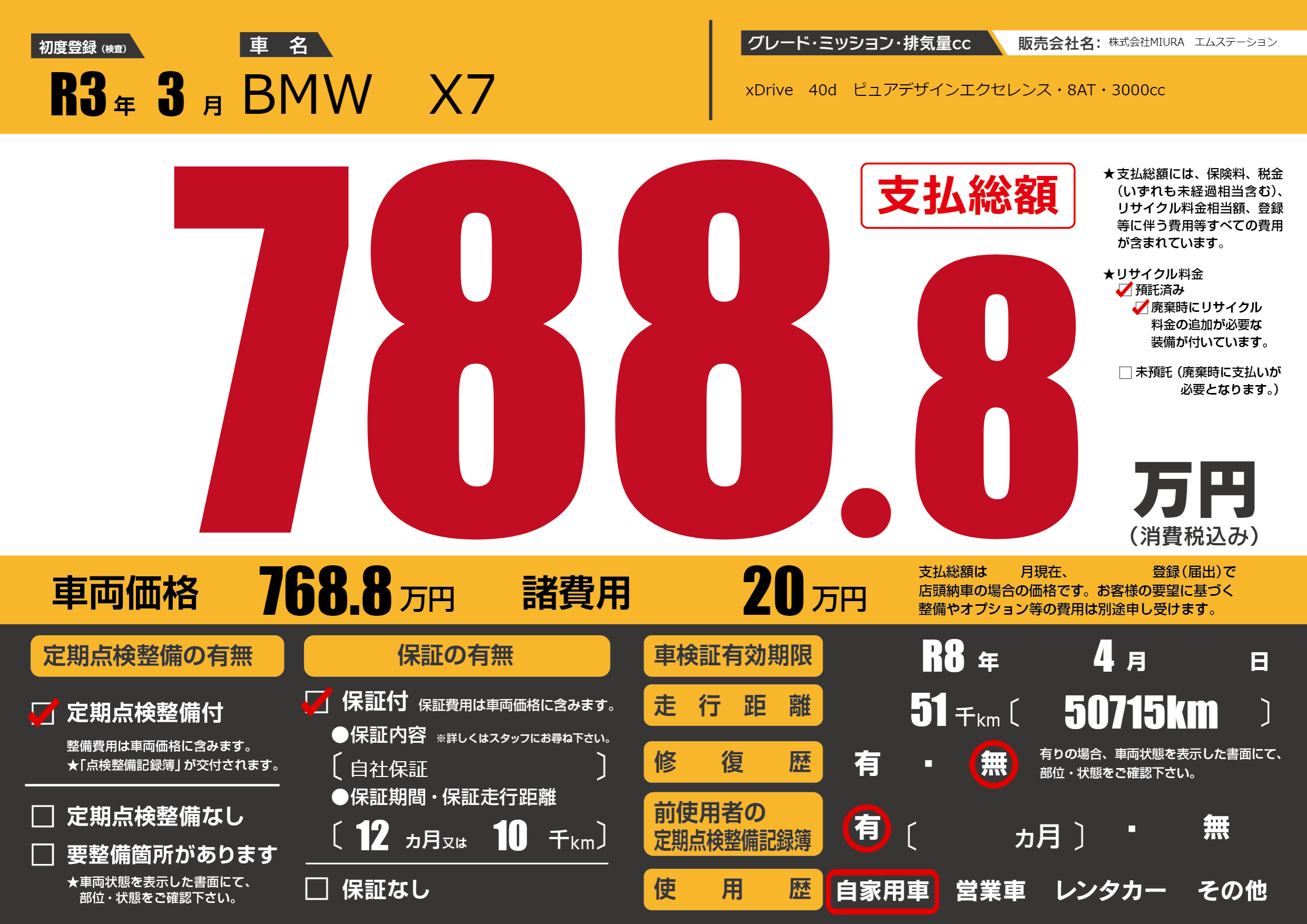 | 車名 | BMW X7 | グレード ミッション 排気量 |