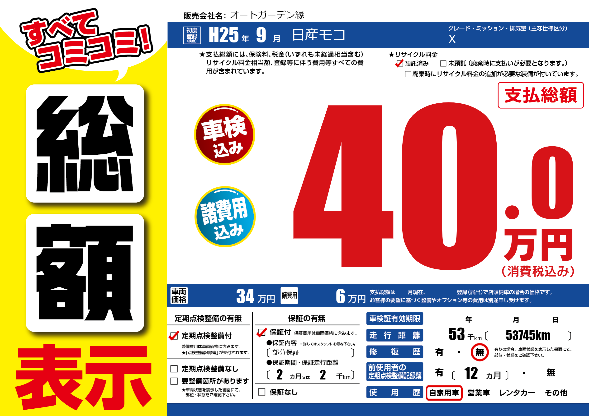 | 車名 | 日産モコ | グレード ミッション 排気量 |