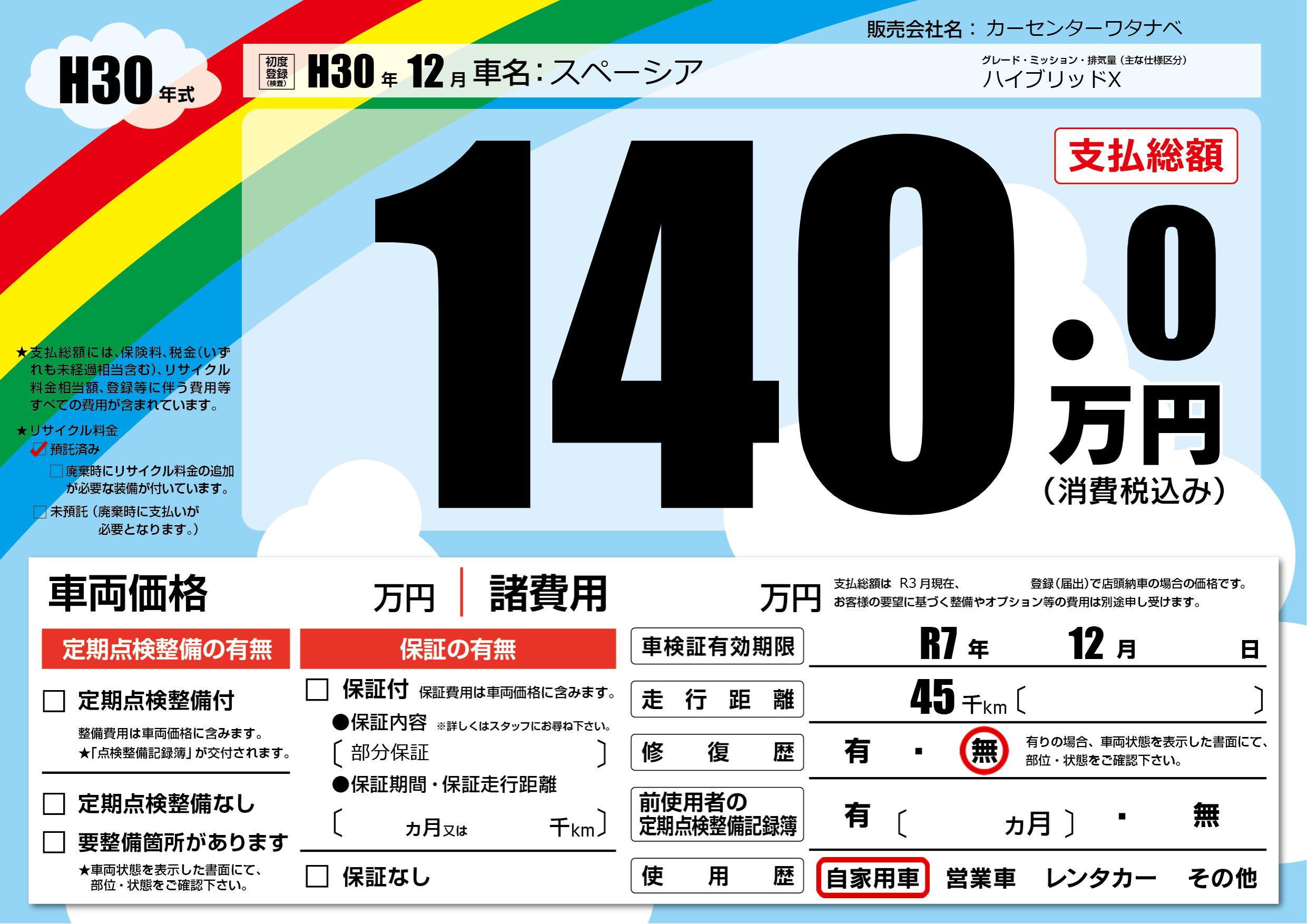 | 車検制限 | R7年 12月 - 日 | ||