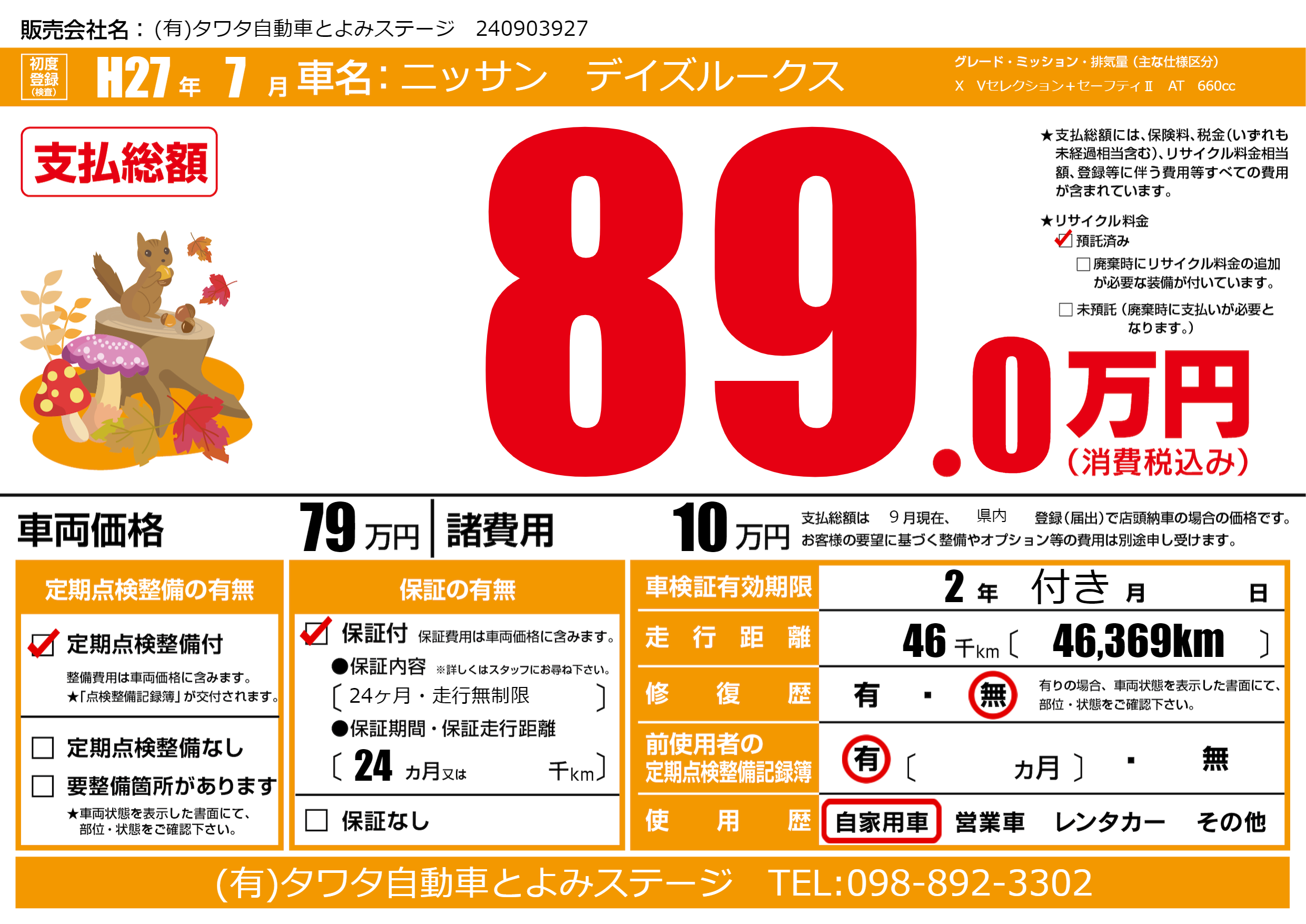 | 車名 | ニッサン デイズルークス | グレード ミッション 排気量 |