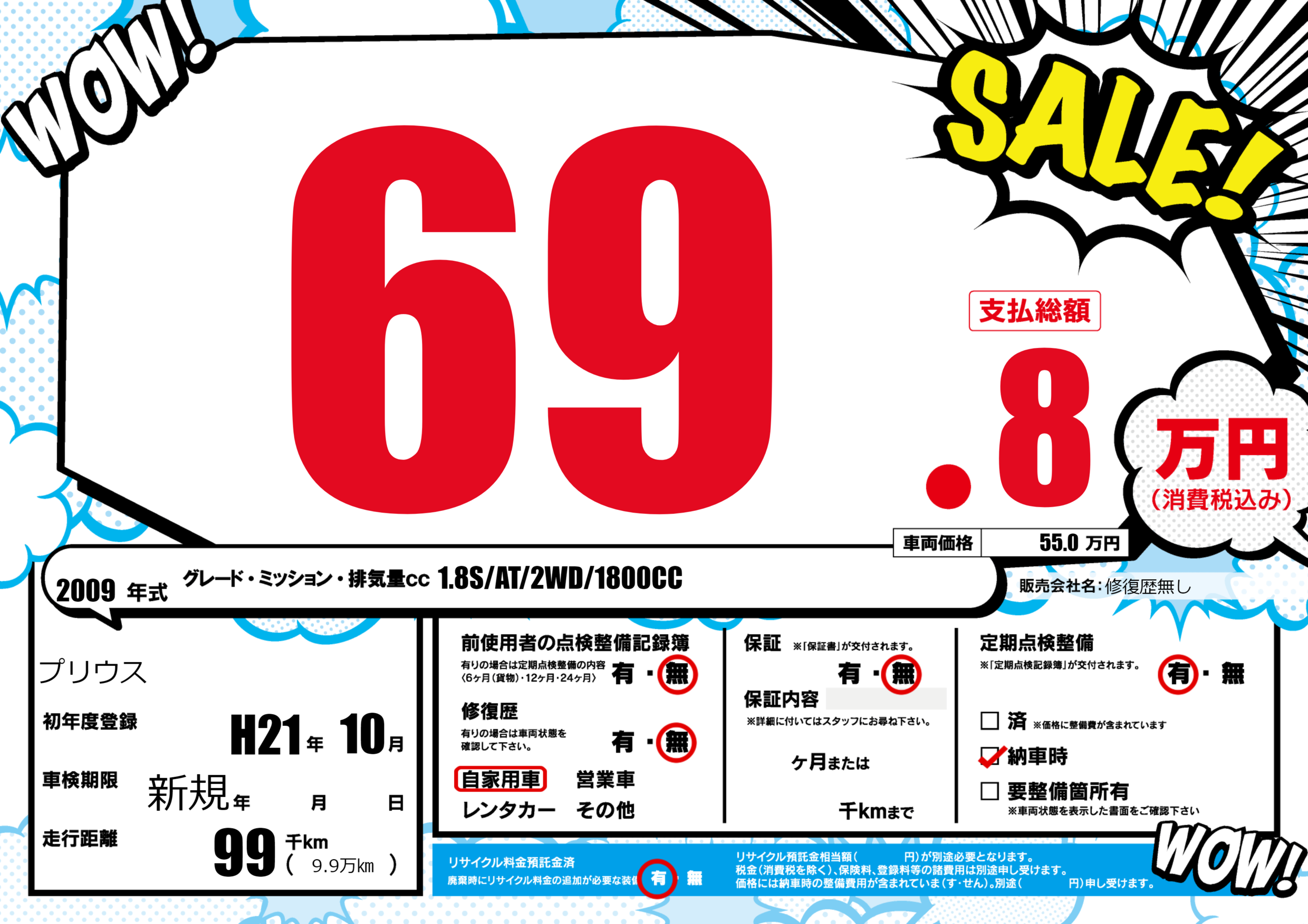 | 走行キロ | 9.9万km | 初年度登録 | H21年10月 |
