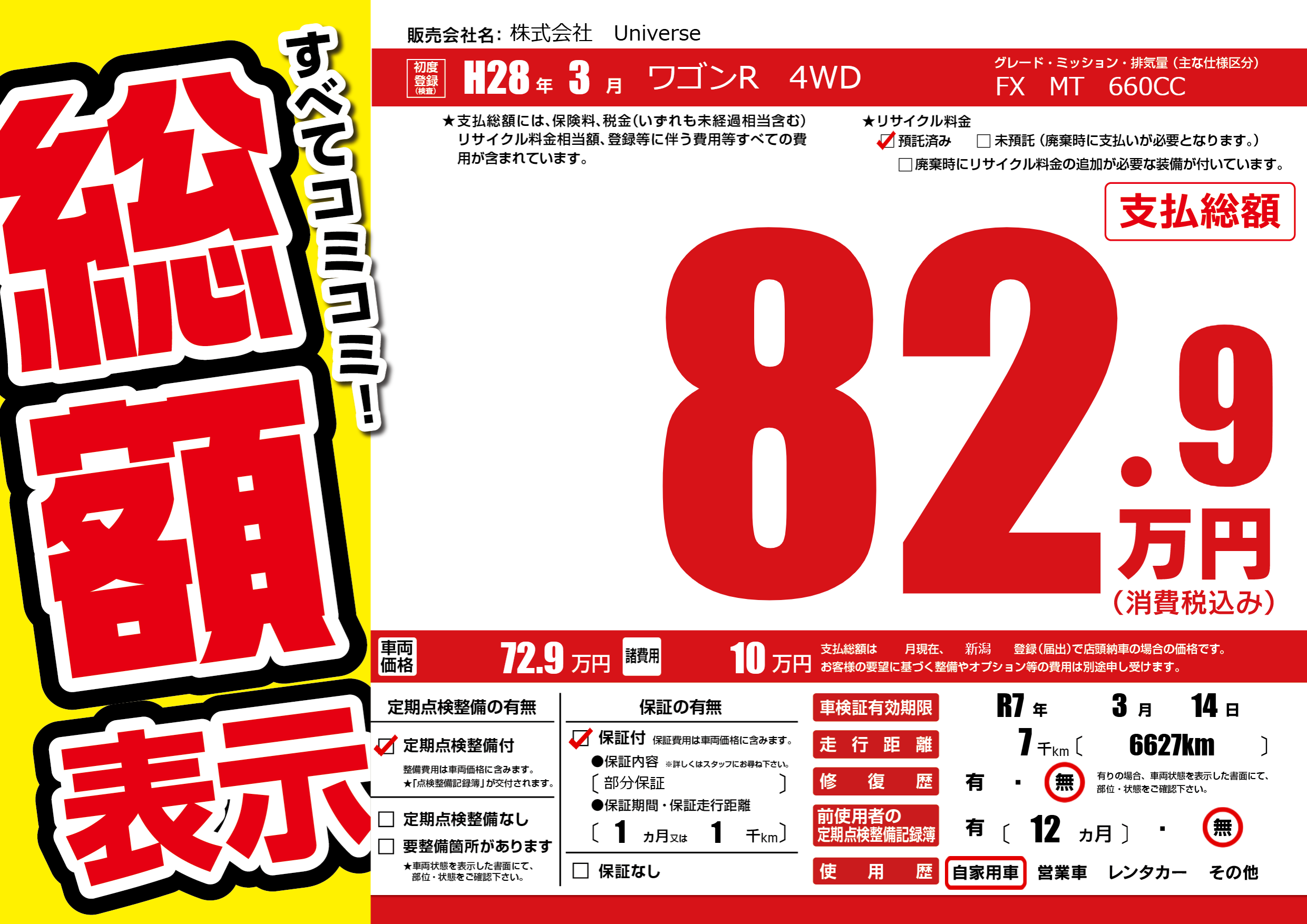 | 車名 | ワゴンR 4WD | グレード ミッション 排気量 |