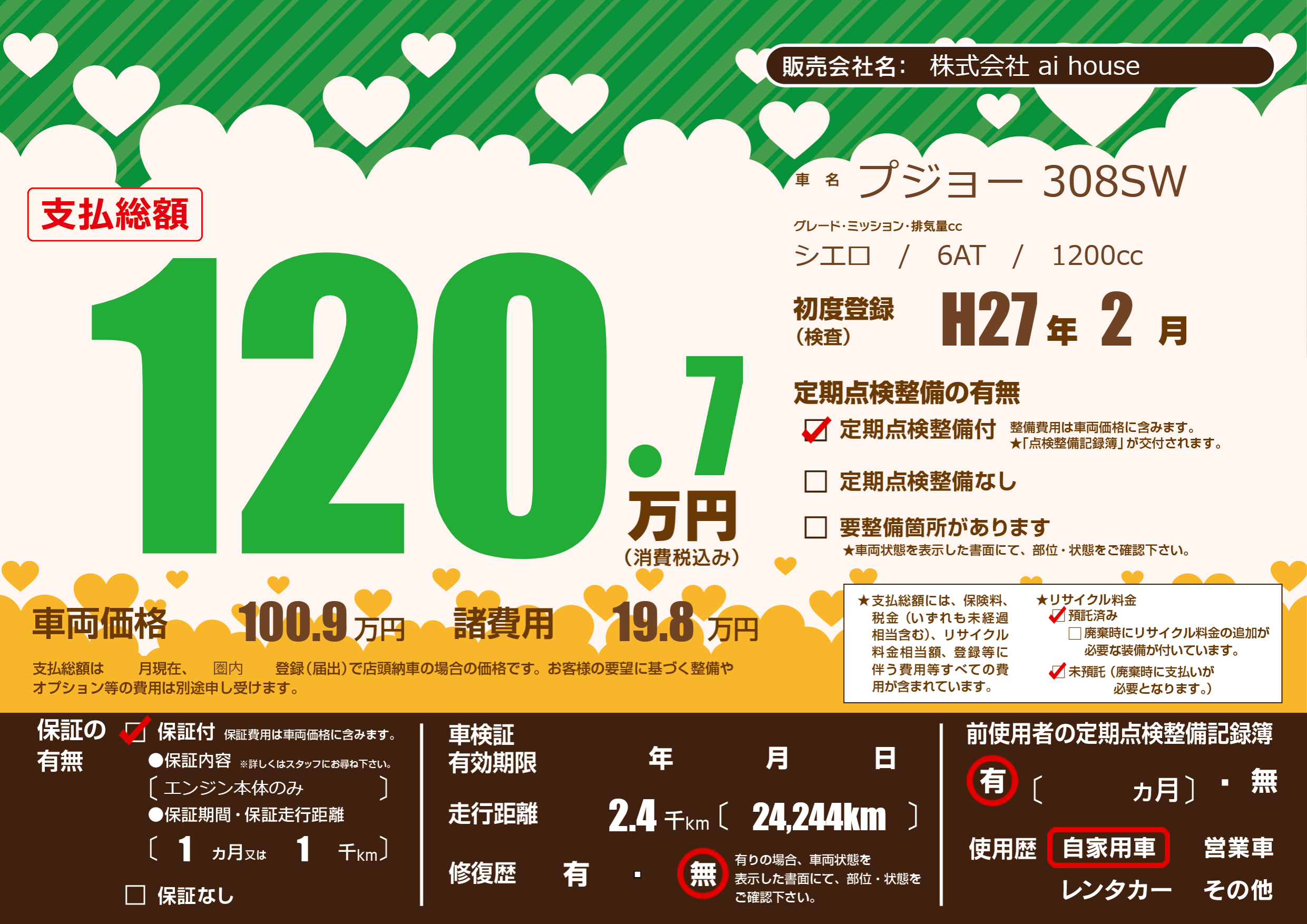 | 車名 | プジョー 308SW | グレード ミッション 排気量 |