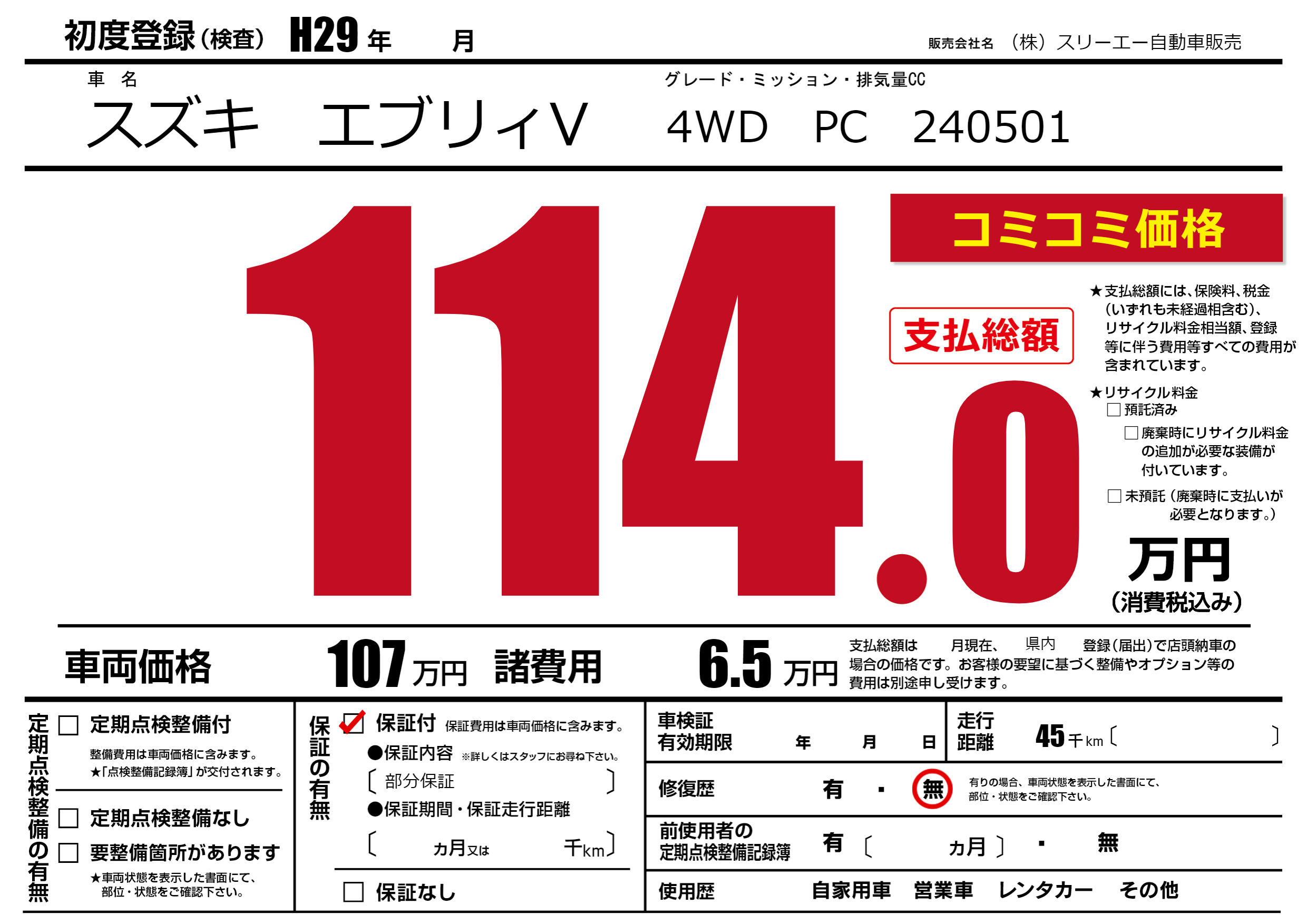 | 走行キロ | 4.5万km | 初年度登録 | H29年---月 |
