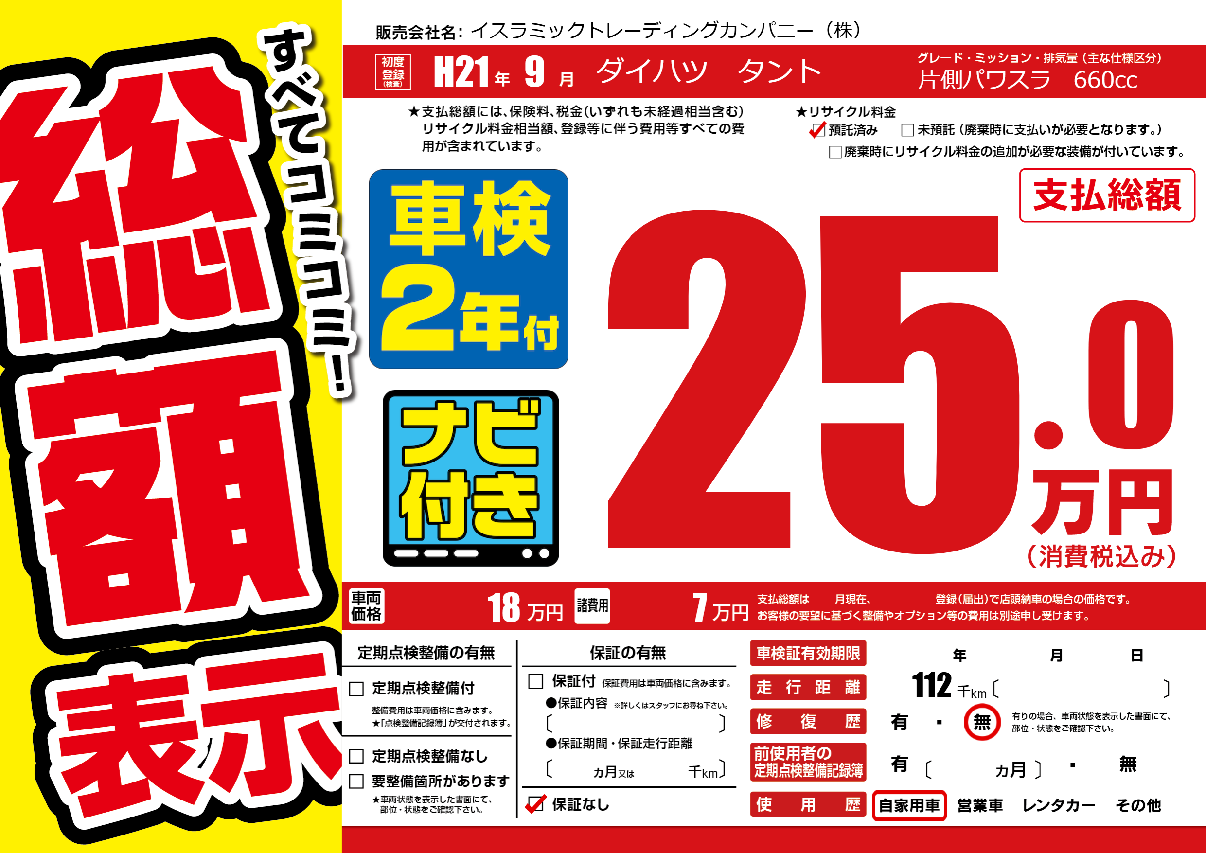 | 走行キロ | 11.2万km | 初年度登録 | H21年9月 |