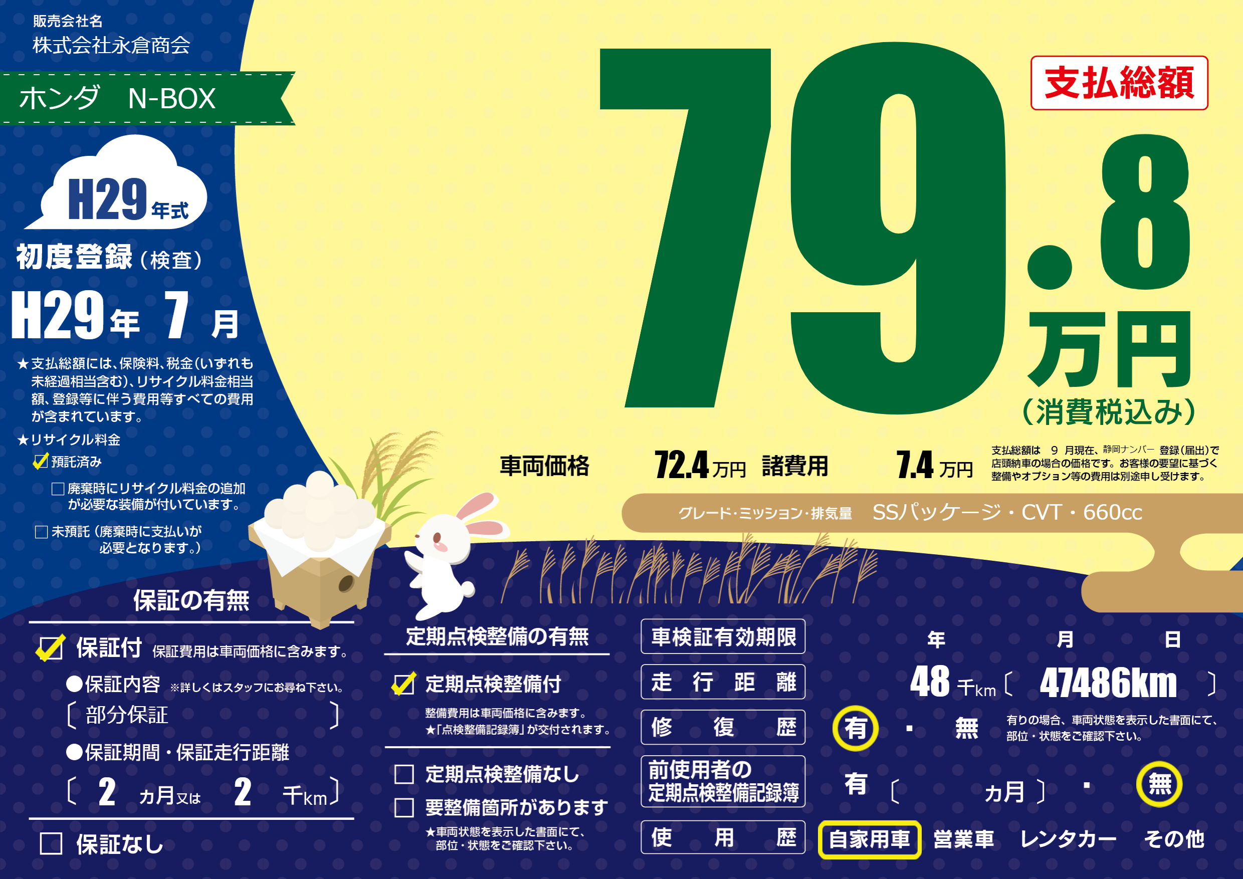 | 車名 | ホンダ N-BOX | グレード ミッション 排気量 |