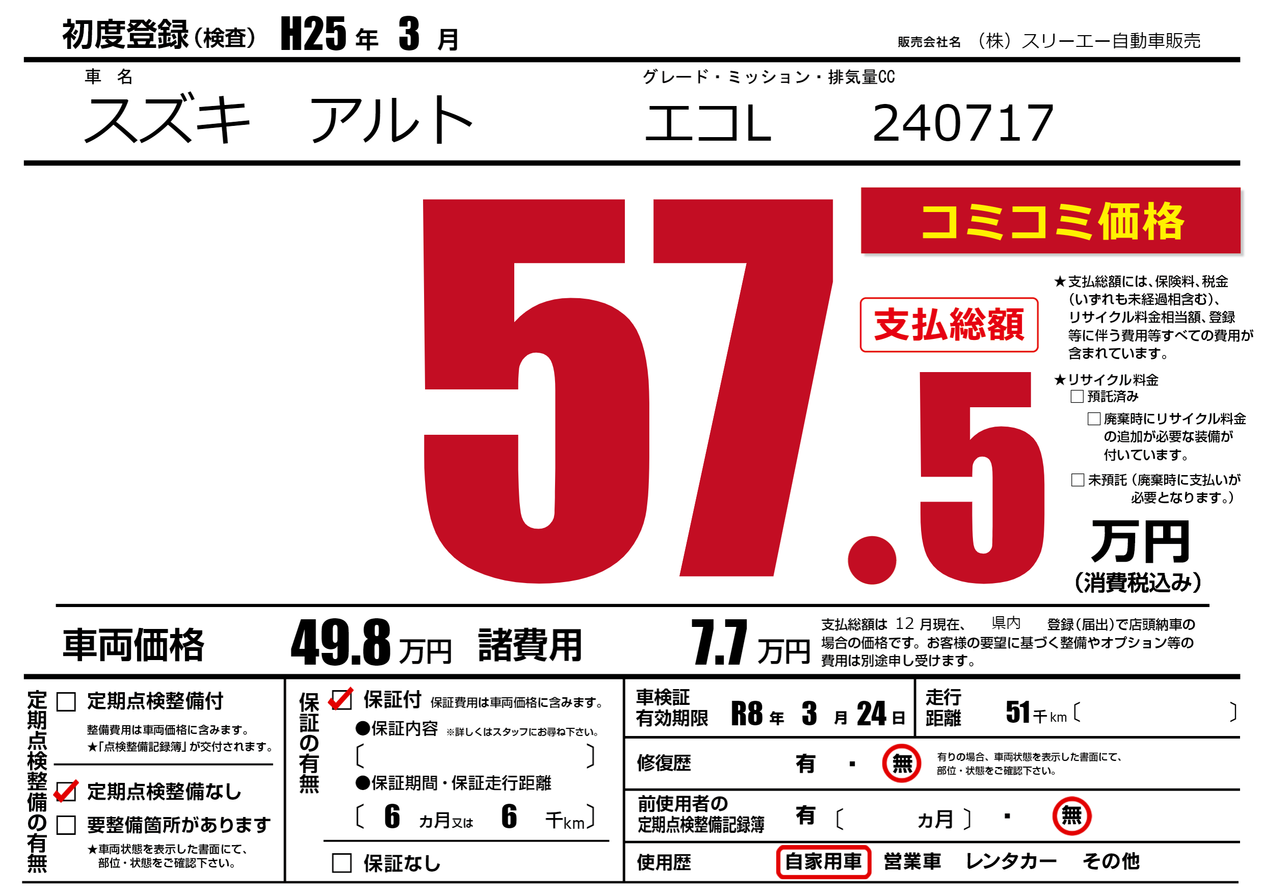 | 車名 | スズキ アルト | グレード ミッション 排気量 |