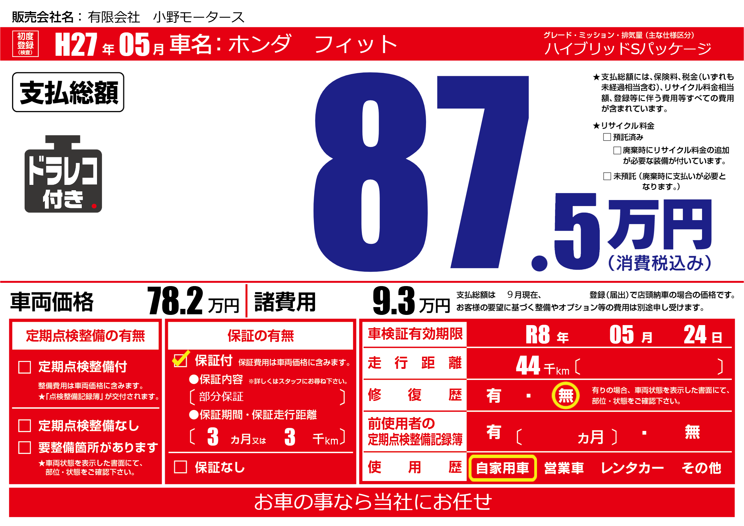 保証付き 保証内容(部分保証) 3ヶ月または(3)千kmまで |