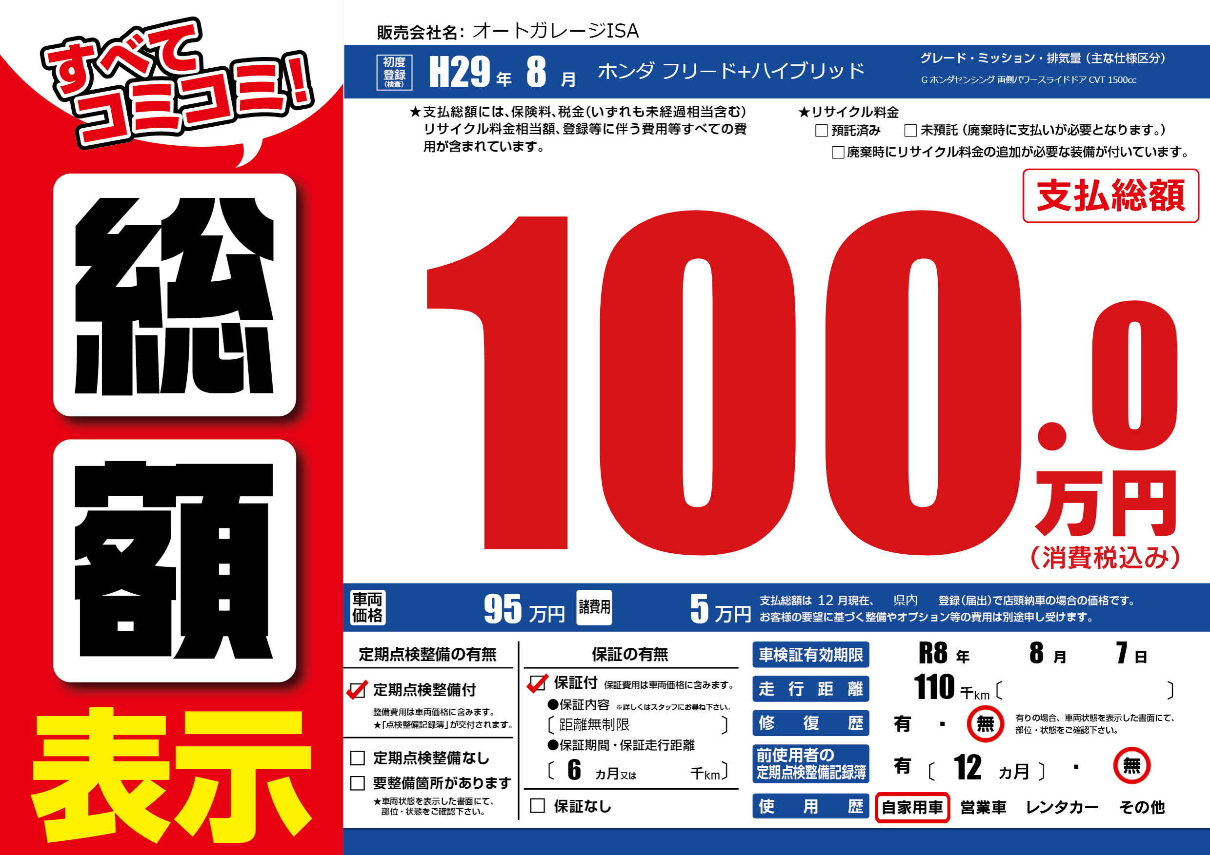 | 車名 | ホンダ フリード+ハイブリッド | グレード ミッション 排気量 |