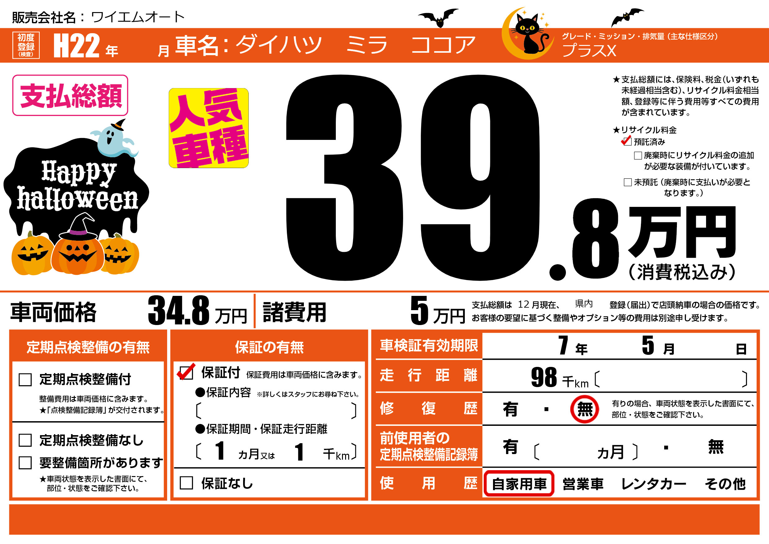 | 走行キロ | 9.8万km | 初年度登録 | H22年---月 |