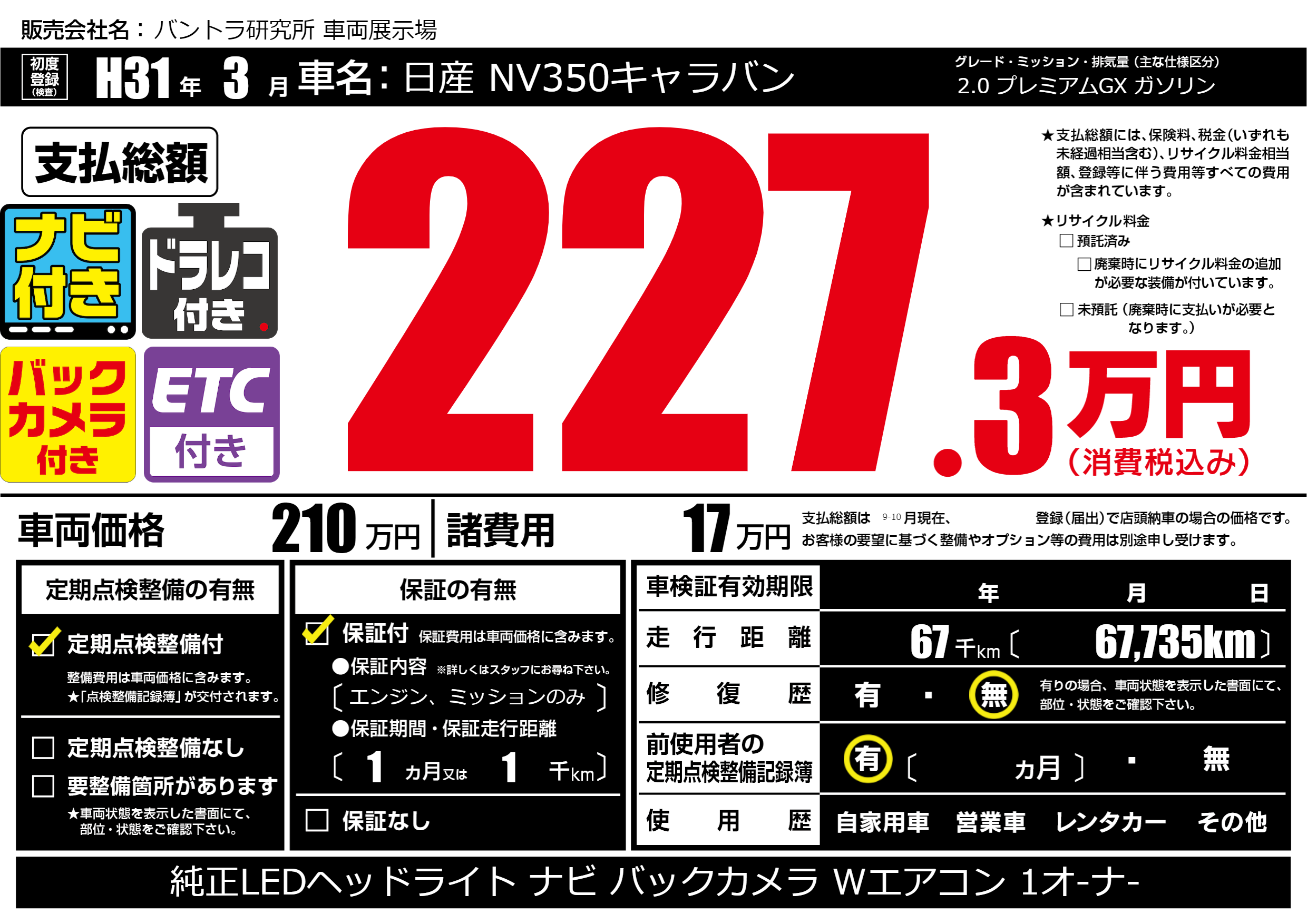 | 車名 | 日産 NV350キャラバン | グレード ミッション 排気量 |