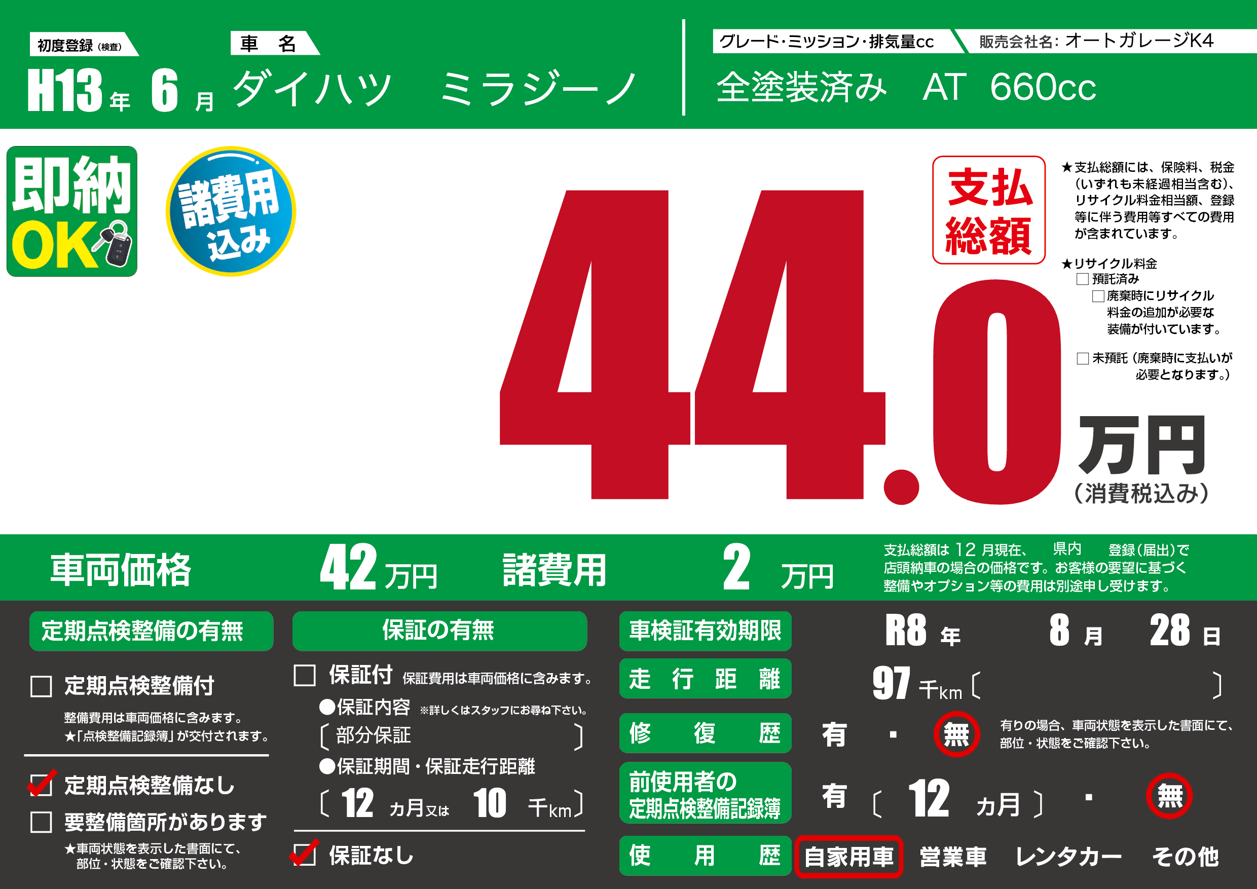 | 走行キロ | 9.7万km | 初年度登録 | H13年6月 |