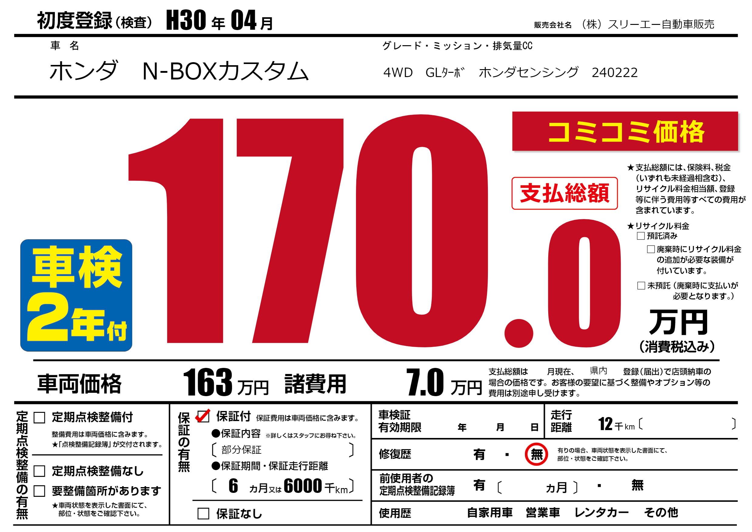 保証付き 保証内容(部分保証) 6ヶ月または(6000)千kmまで |