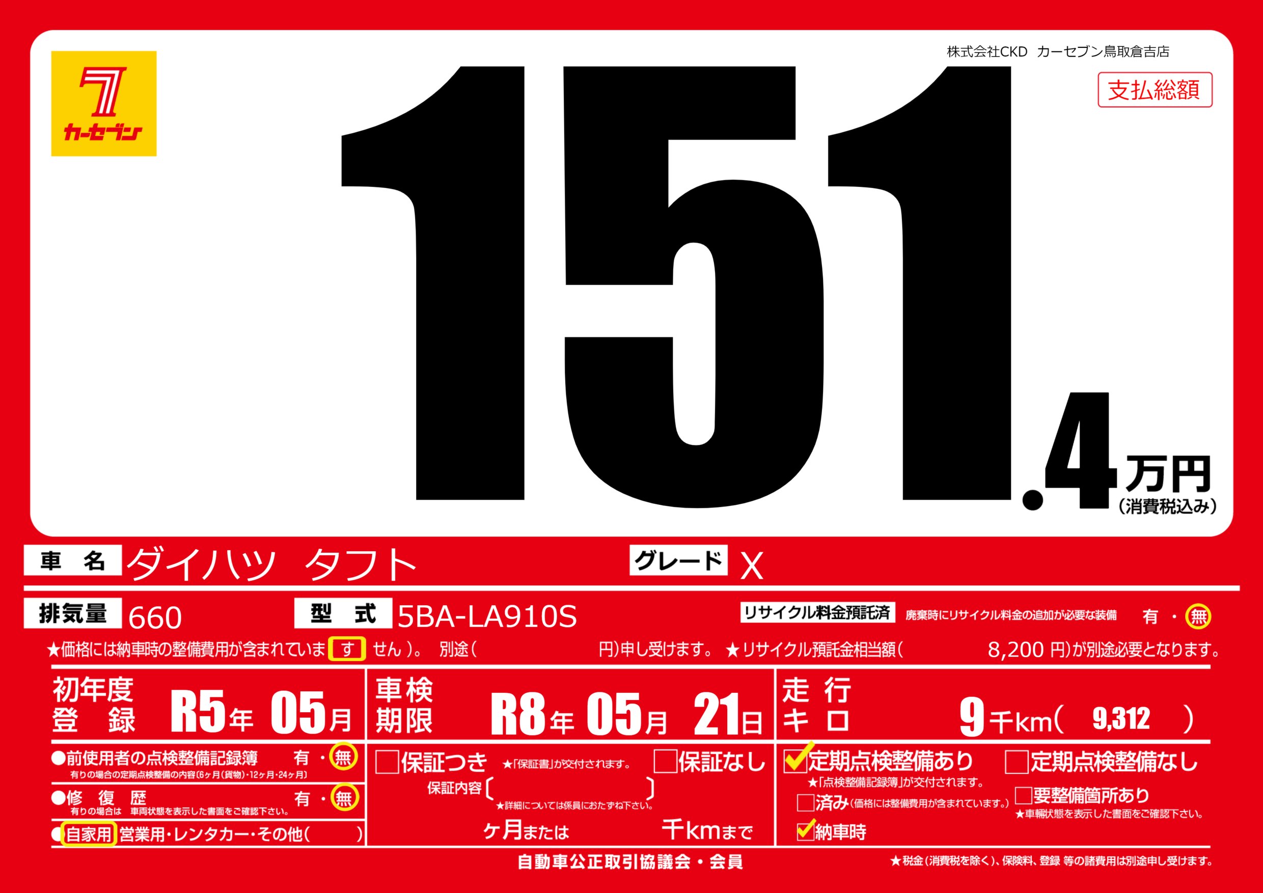 | 定期点検整備 | 定期点検整備あり 納車時あり | ||