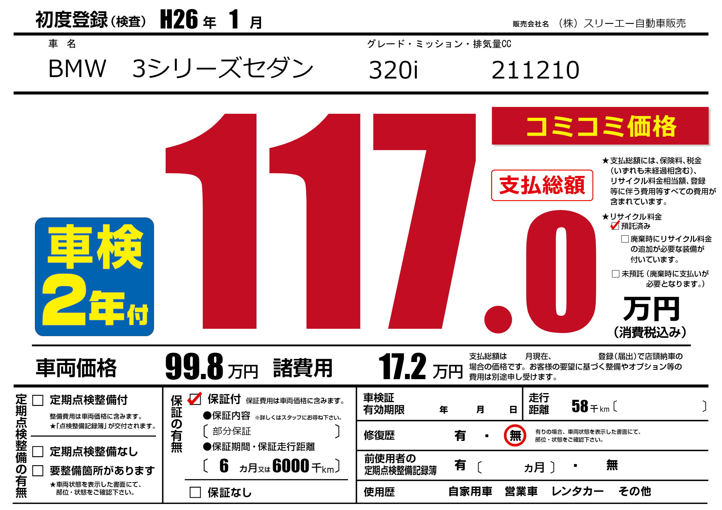| 車名 | BMW 3シリーズセダン | グレード ミッション 排気量 |