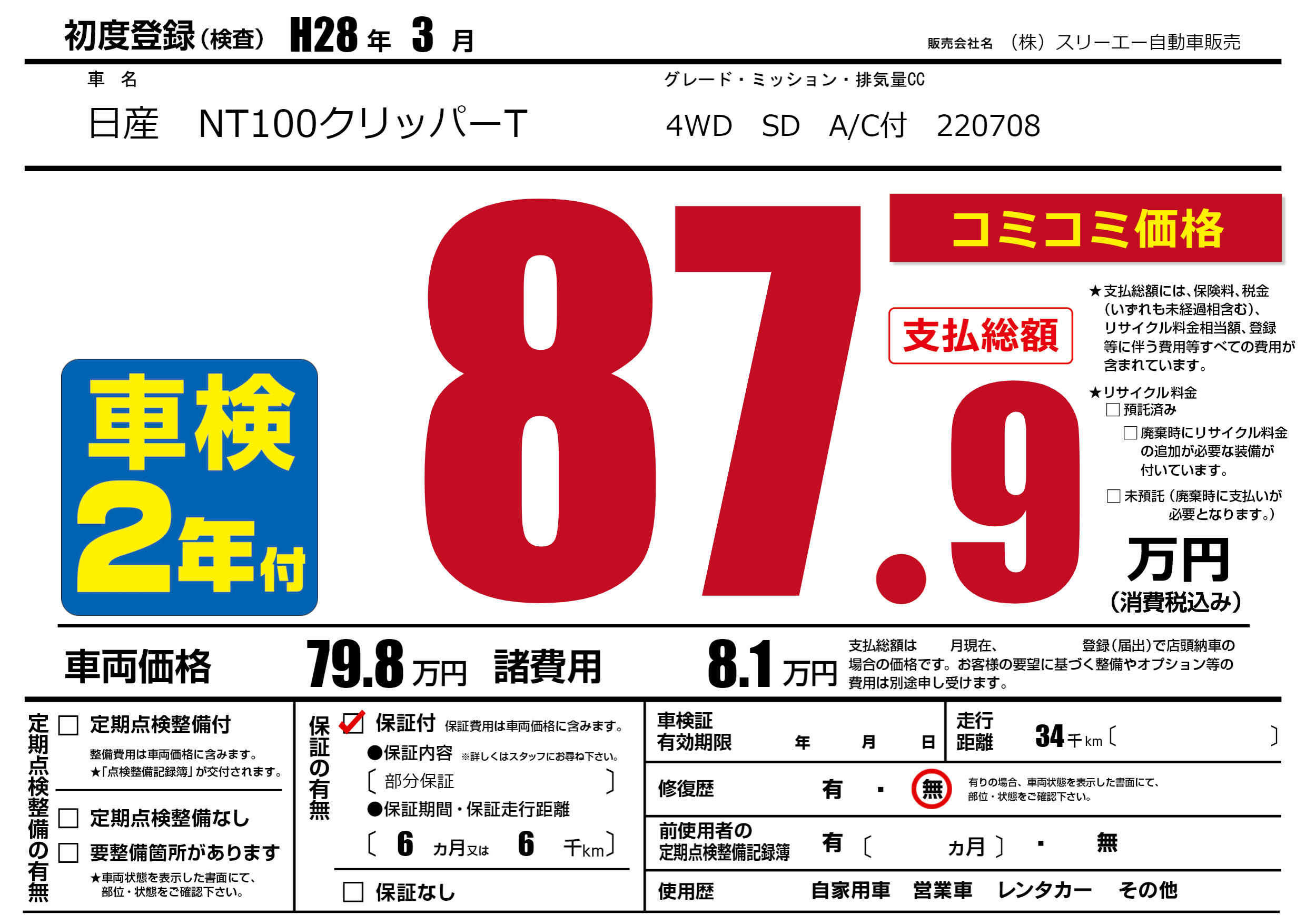 保証付き 保証内容(部分保証) 6ヶ月または(6)千kmまで |