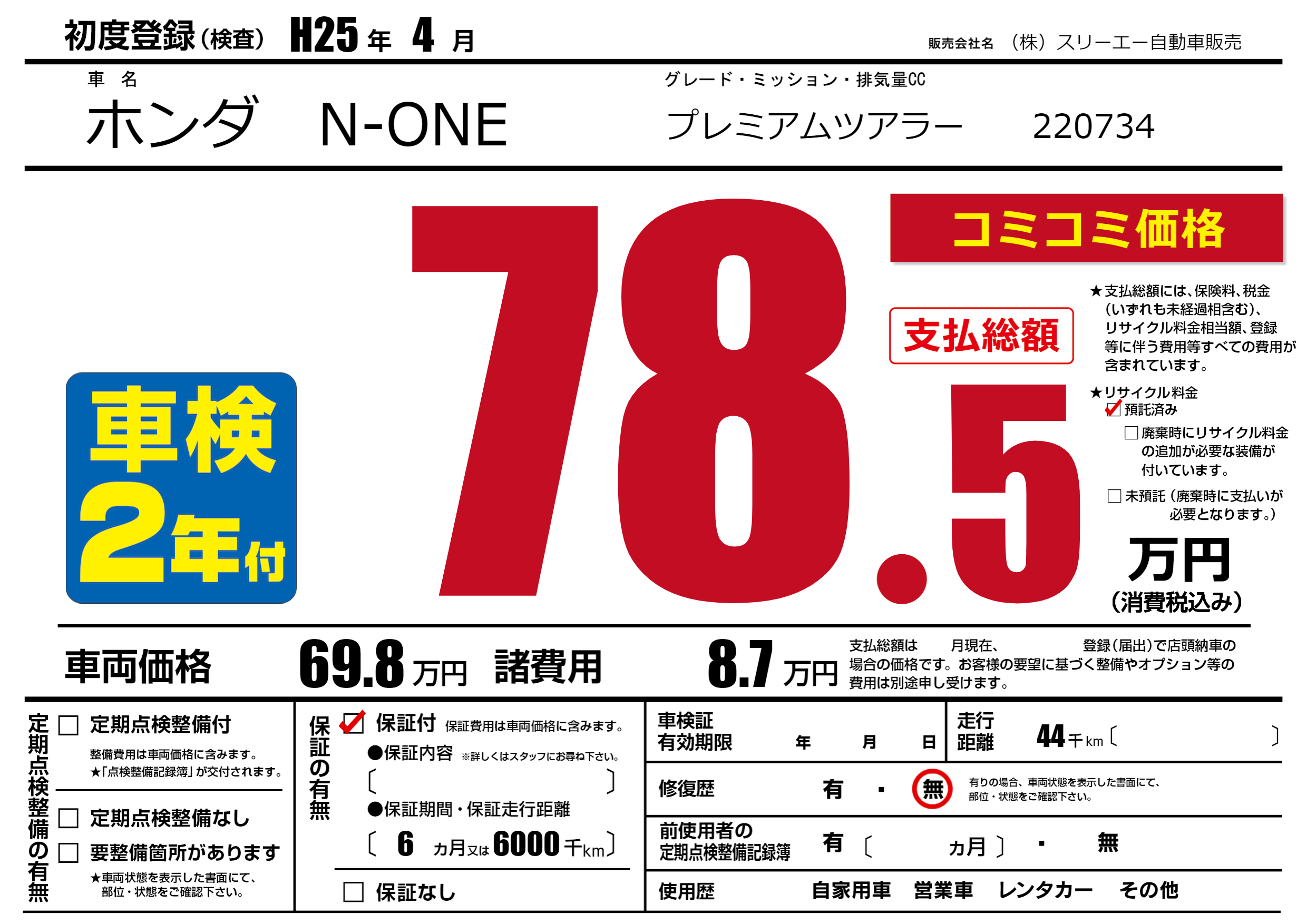 | 車名 | ホンダ N-ONE | グレード ミッション 排気量 |