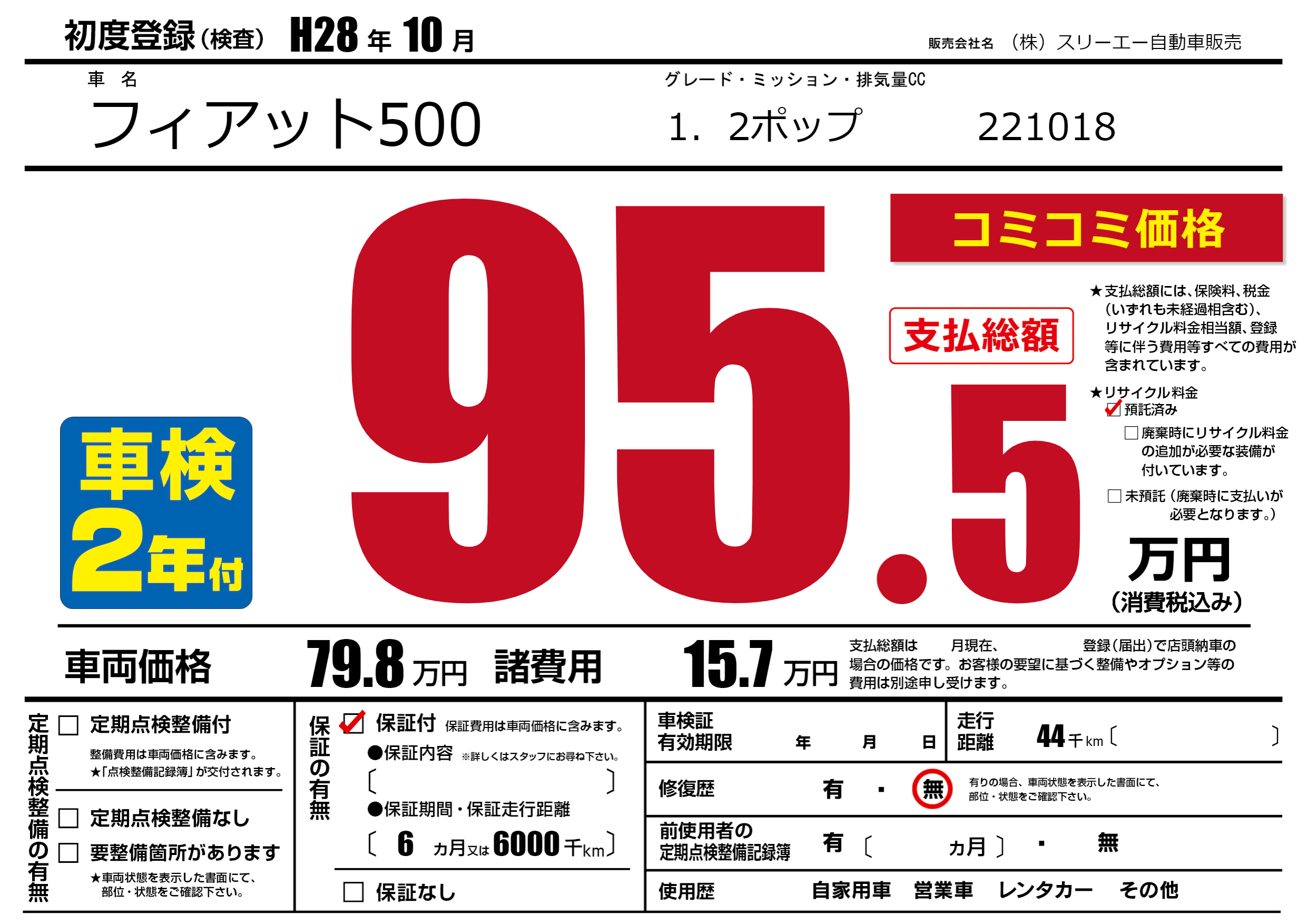 | 車名 | フィアット500 | グレード ミッション 排気量 |