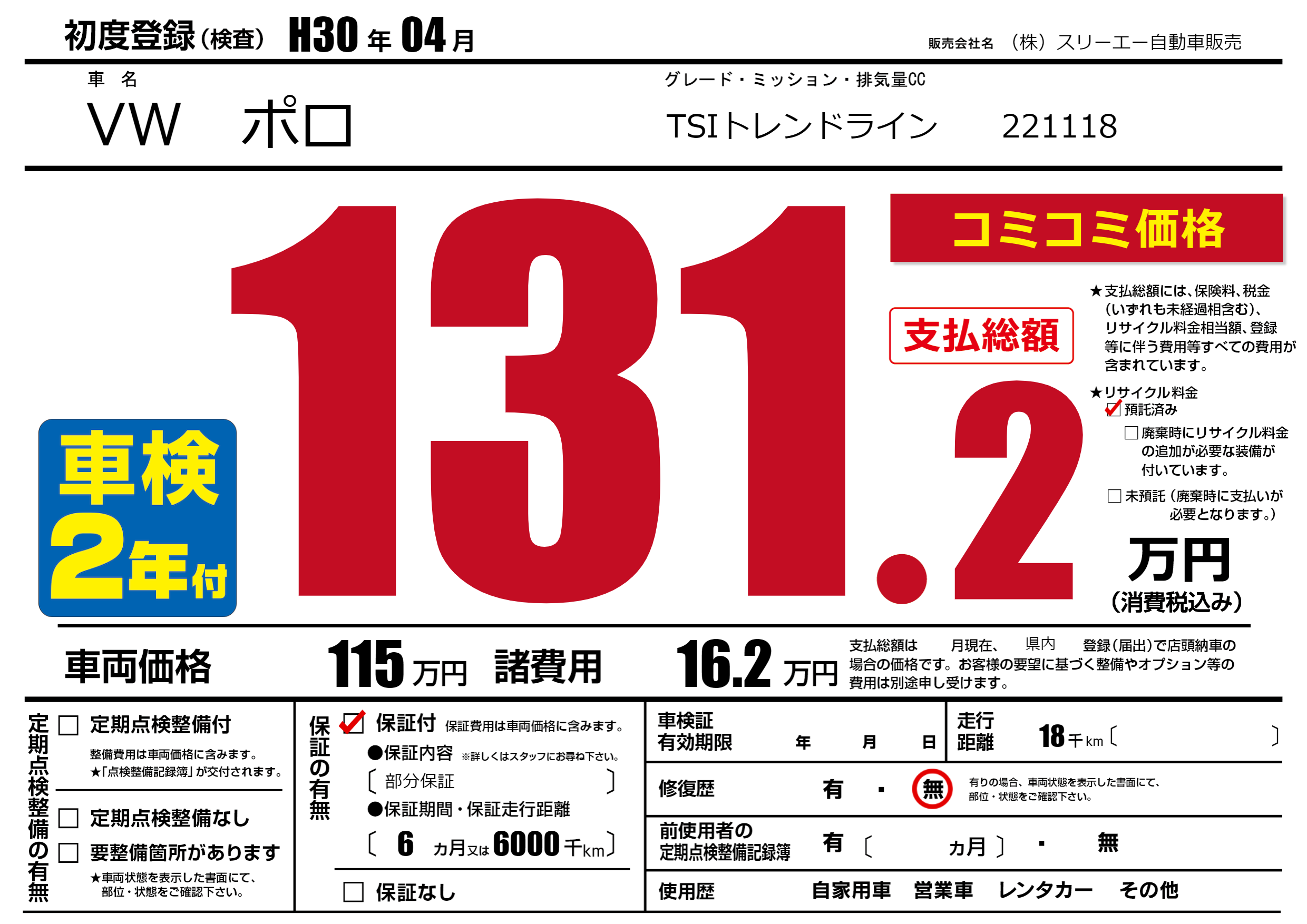 保証付き 保証内容(部分保証) 6ヶ月または(6000)千kmまで |