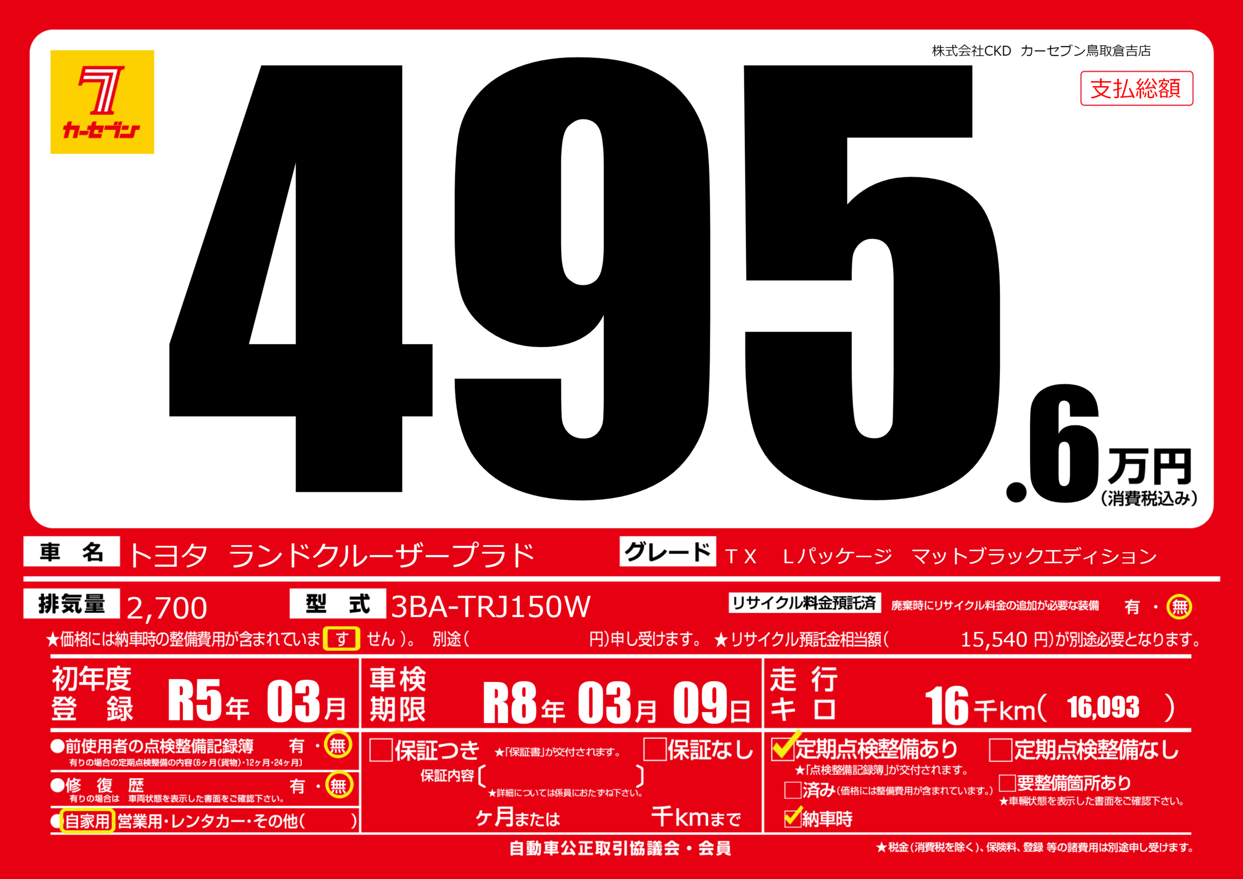 | 車名 | トヨタ ランドクルーザープラド | グレード ミッション 排気量 |