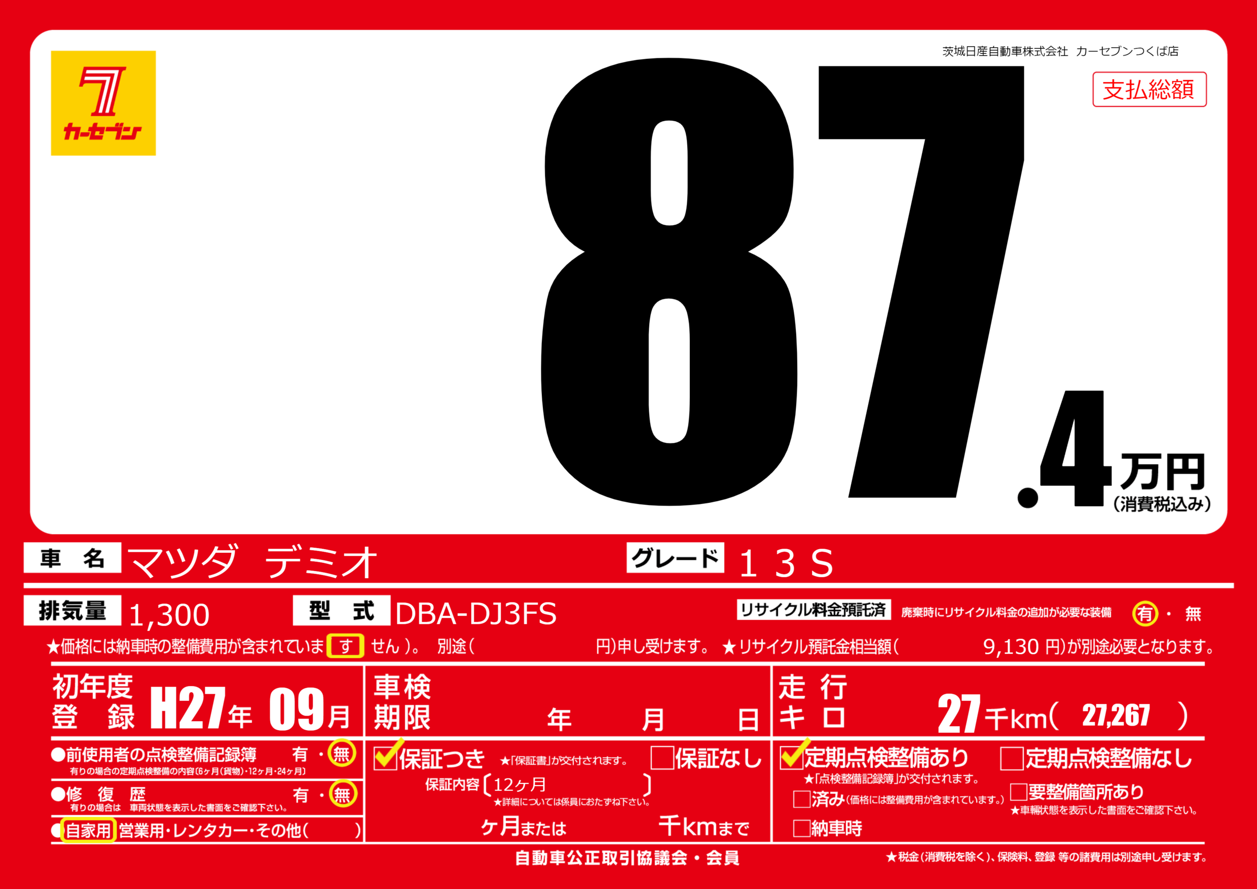 | 車名 | マツダ デミオ | グレード ミッション 排気量 |