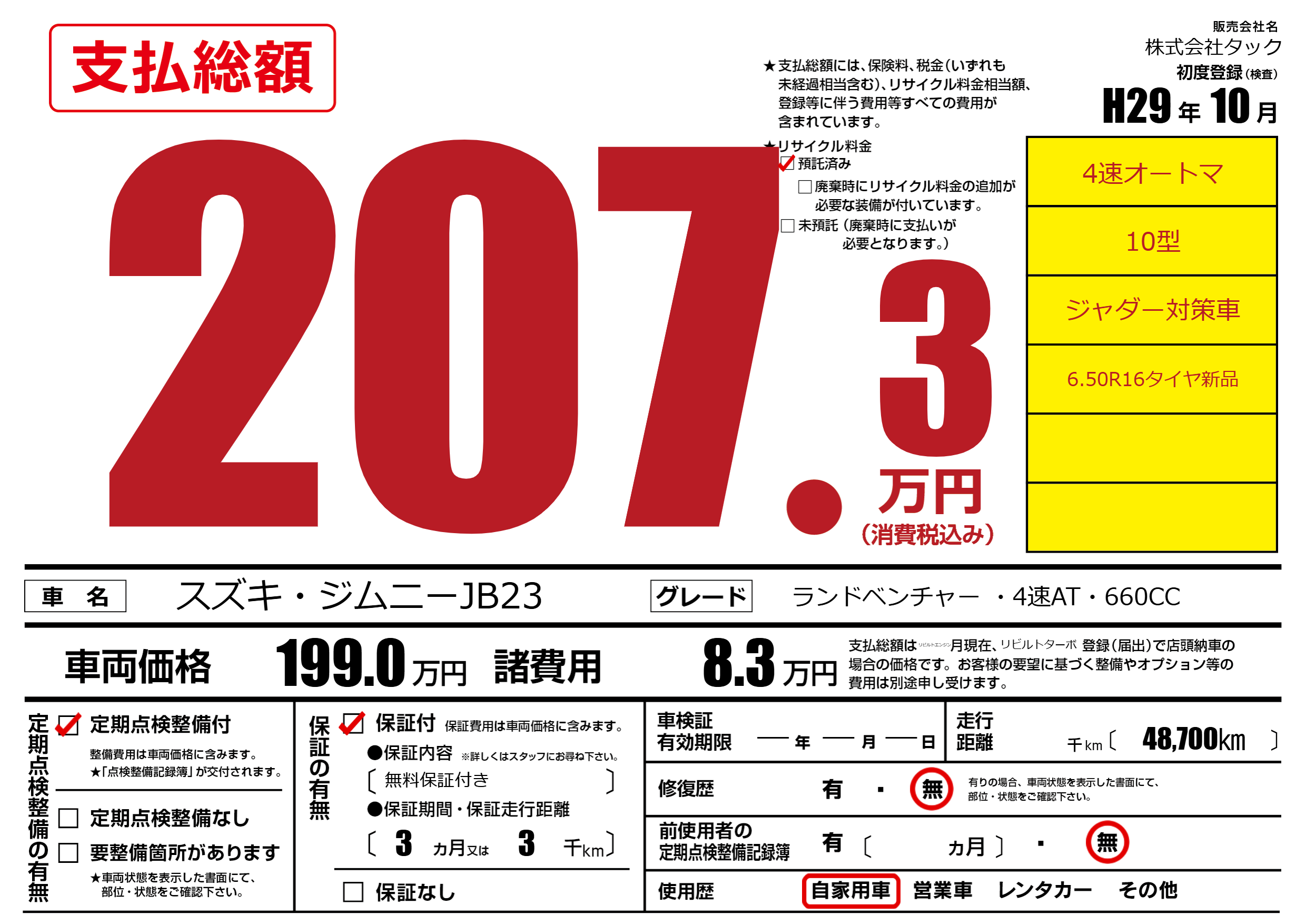 | 車名 | スズキ・ジムニーJB23 | グレード ミッション 排気量 |