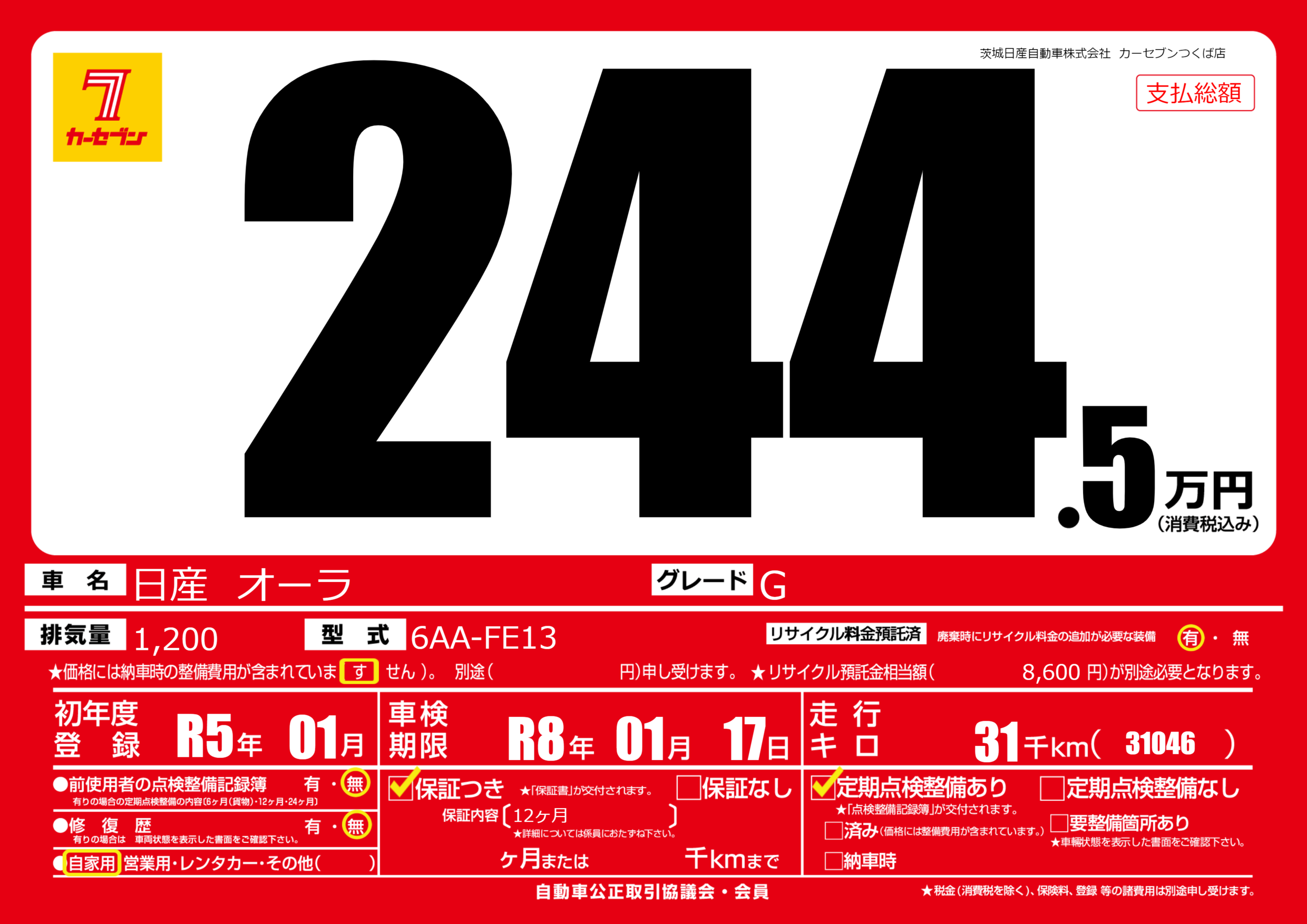 | 車名 | 日産 オーラ | グレード ミッション 排気量 |