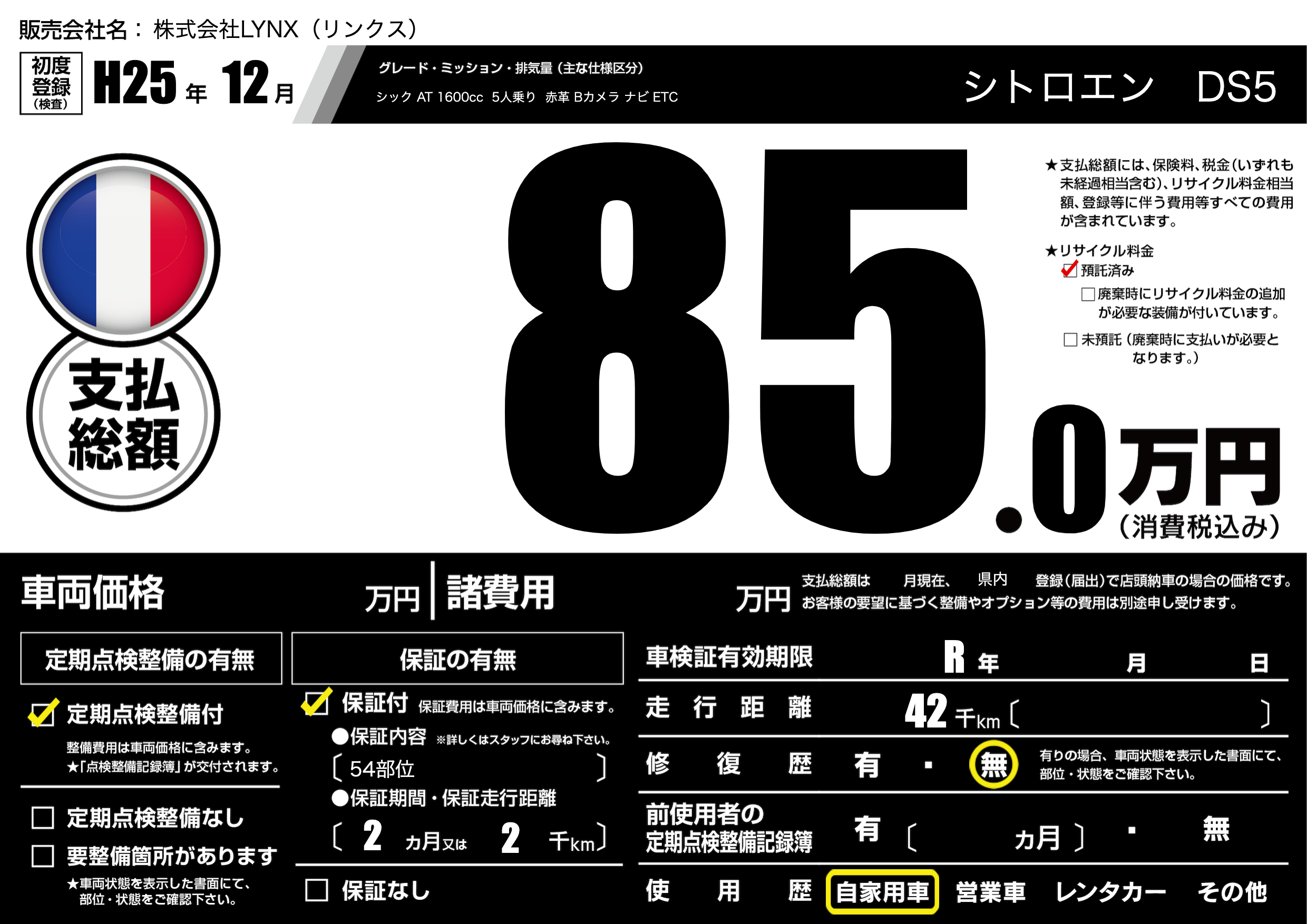 | 車名 | シトロエン DS5 | グレード ミッション 排気量 |