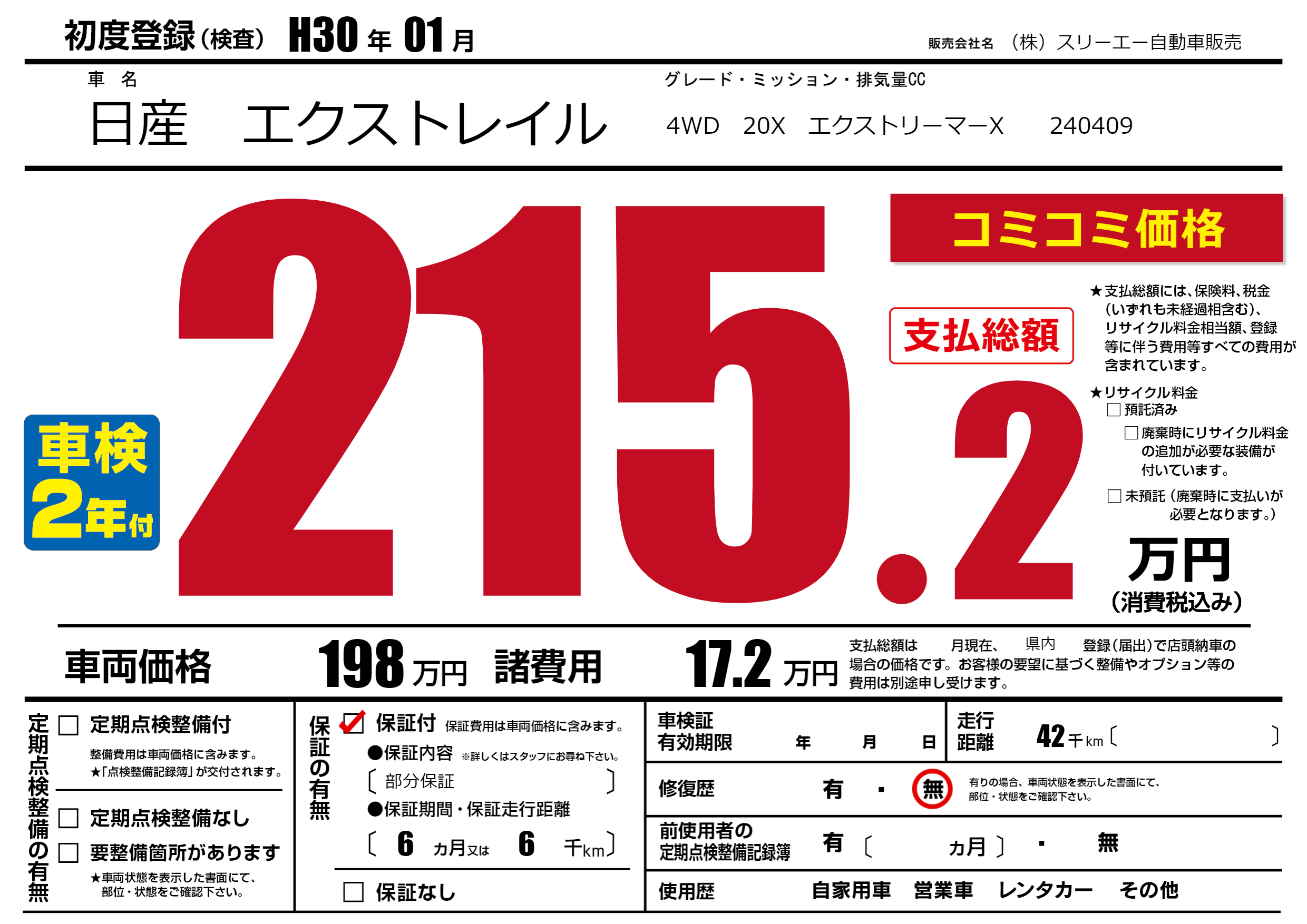 | 走行キロ | 4.2万km | 初年度登録 | H30年01月 |