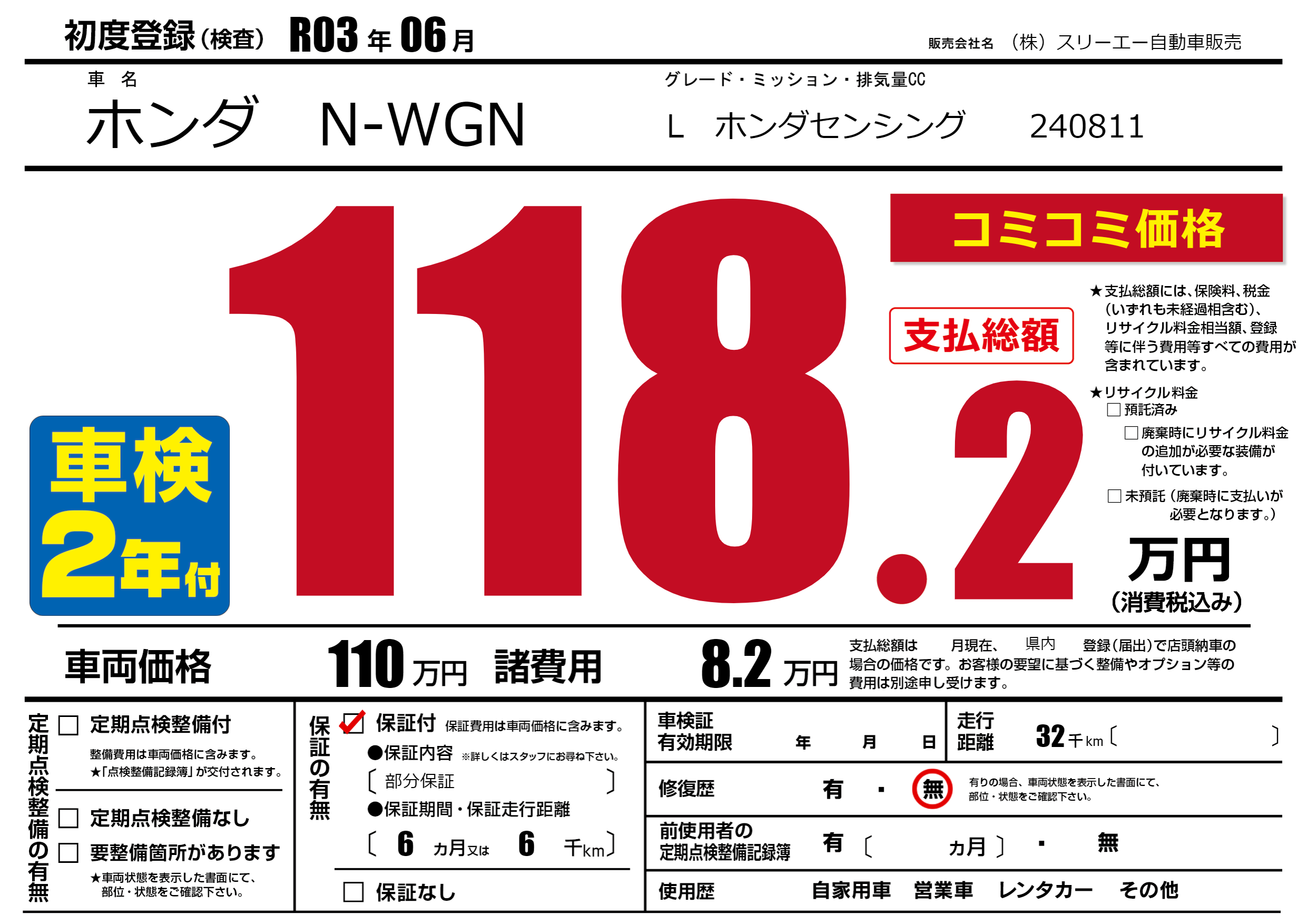 保証付き 保証内容(部分保証) 6ヶ月または(6)千kmまで |