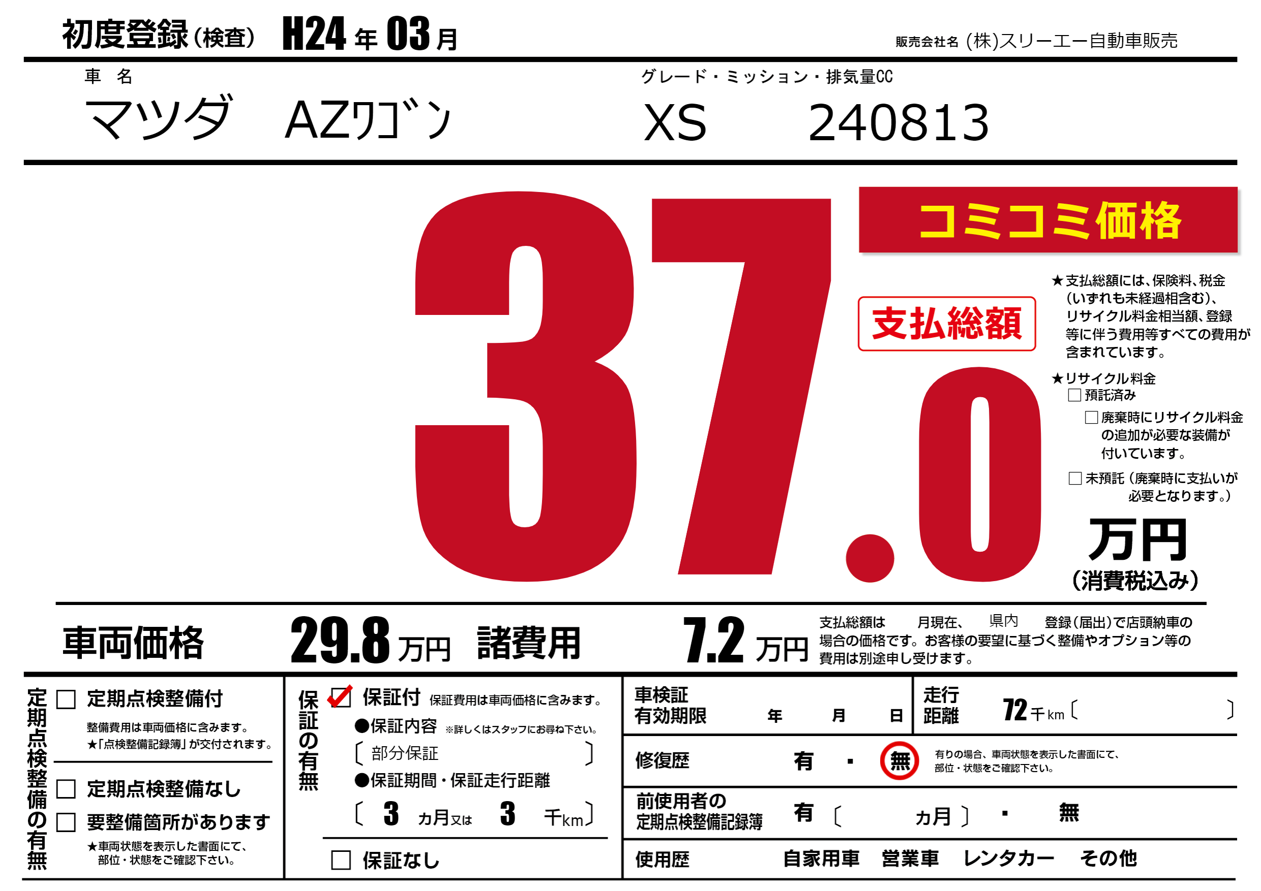 | 車名 | マツダ AZワゴン | グレード ミッション 排気量 |