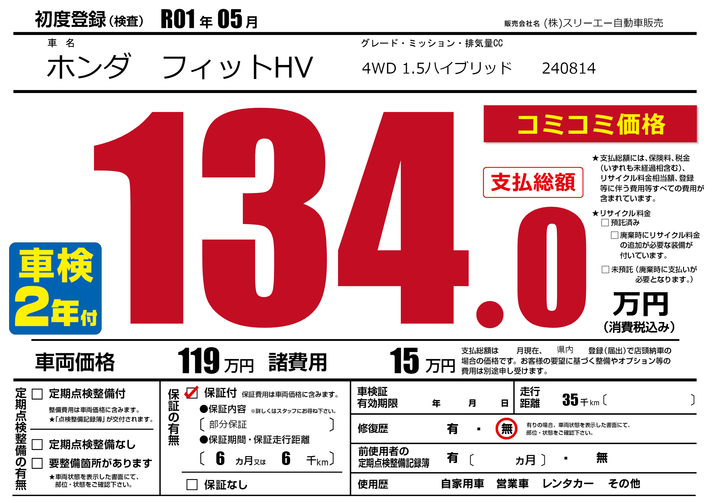 保証付き 保証内容(部分保証) 6ヶ月または(6)千kmまで |
