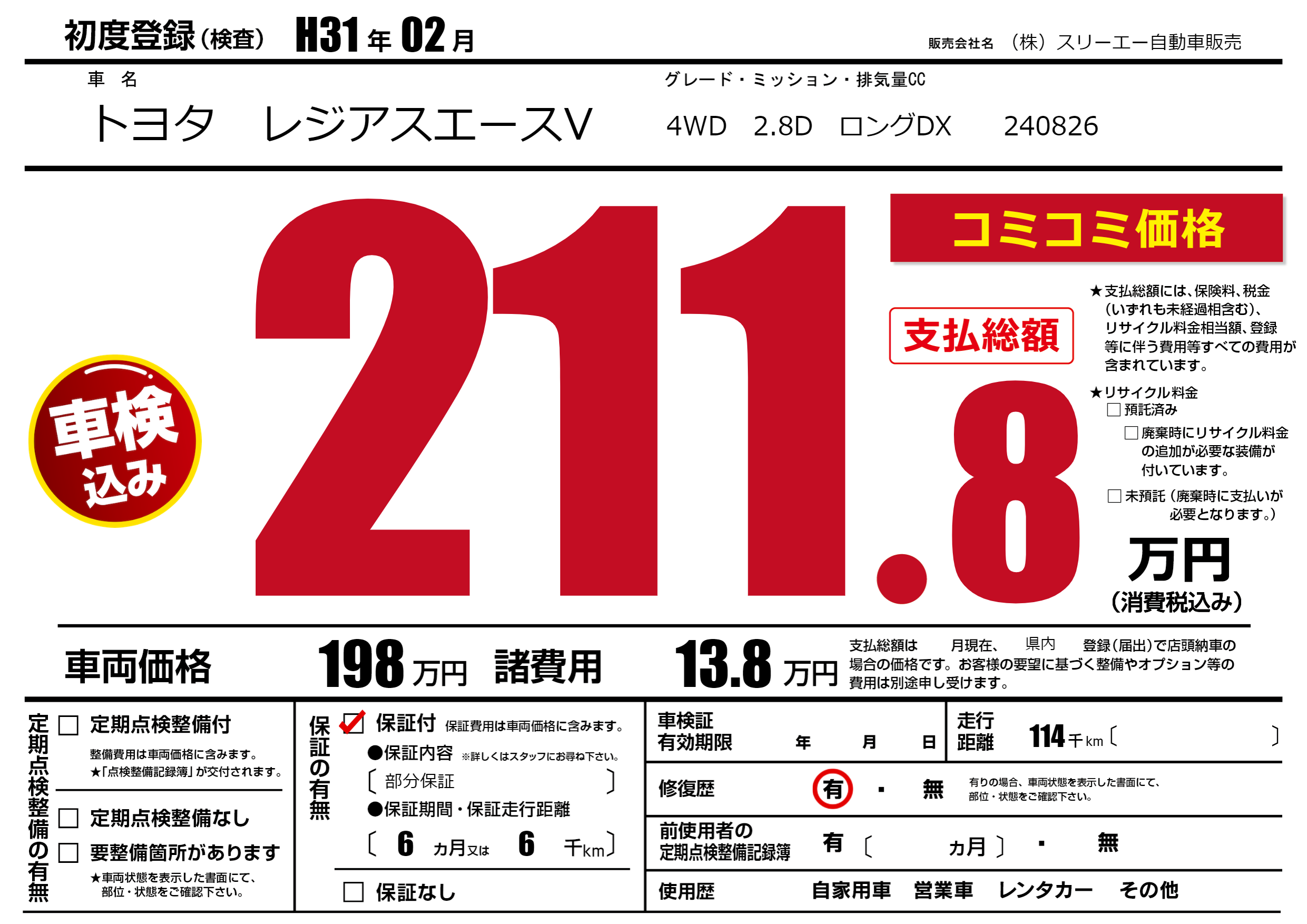 保証付き 保証内容(部分保証) 6ヶ月または(6)千kmまで |