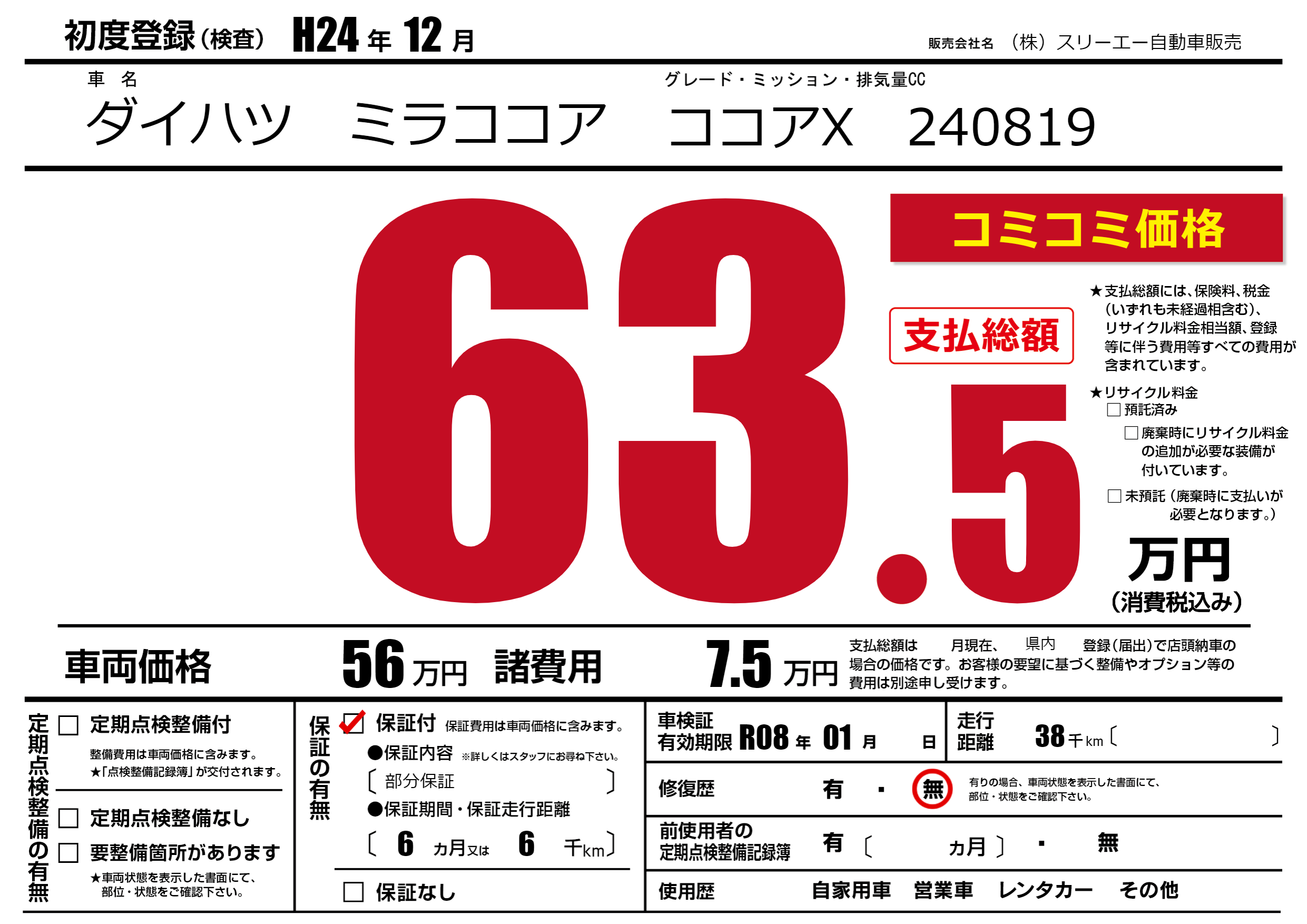 | 走行キロ | 3.8万km | 初年度登録 | H24年12月 |