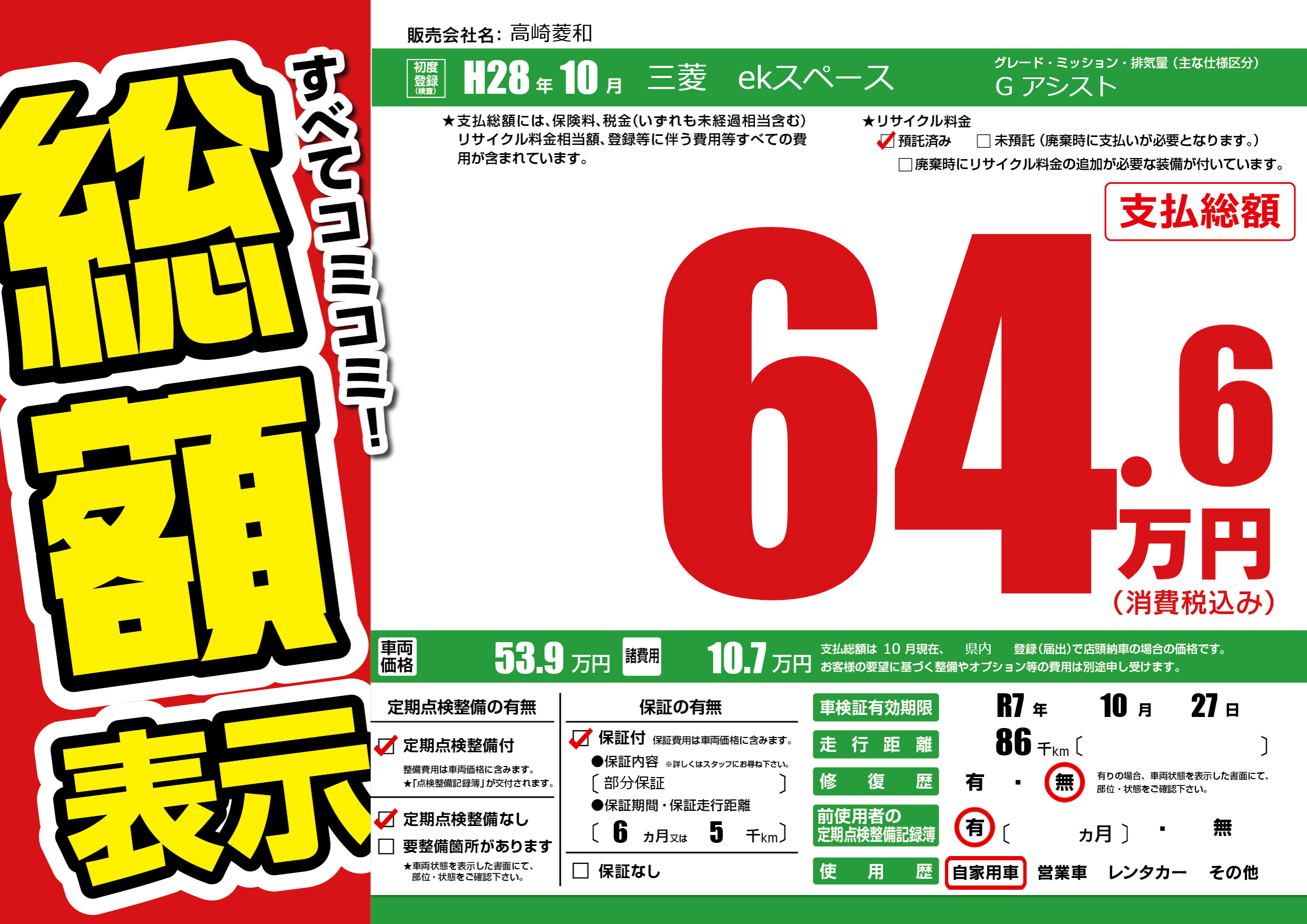 | 車名 | 三菱 ekスペース | グレード ミッション 排気量 |