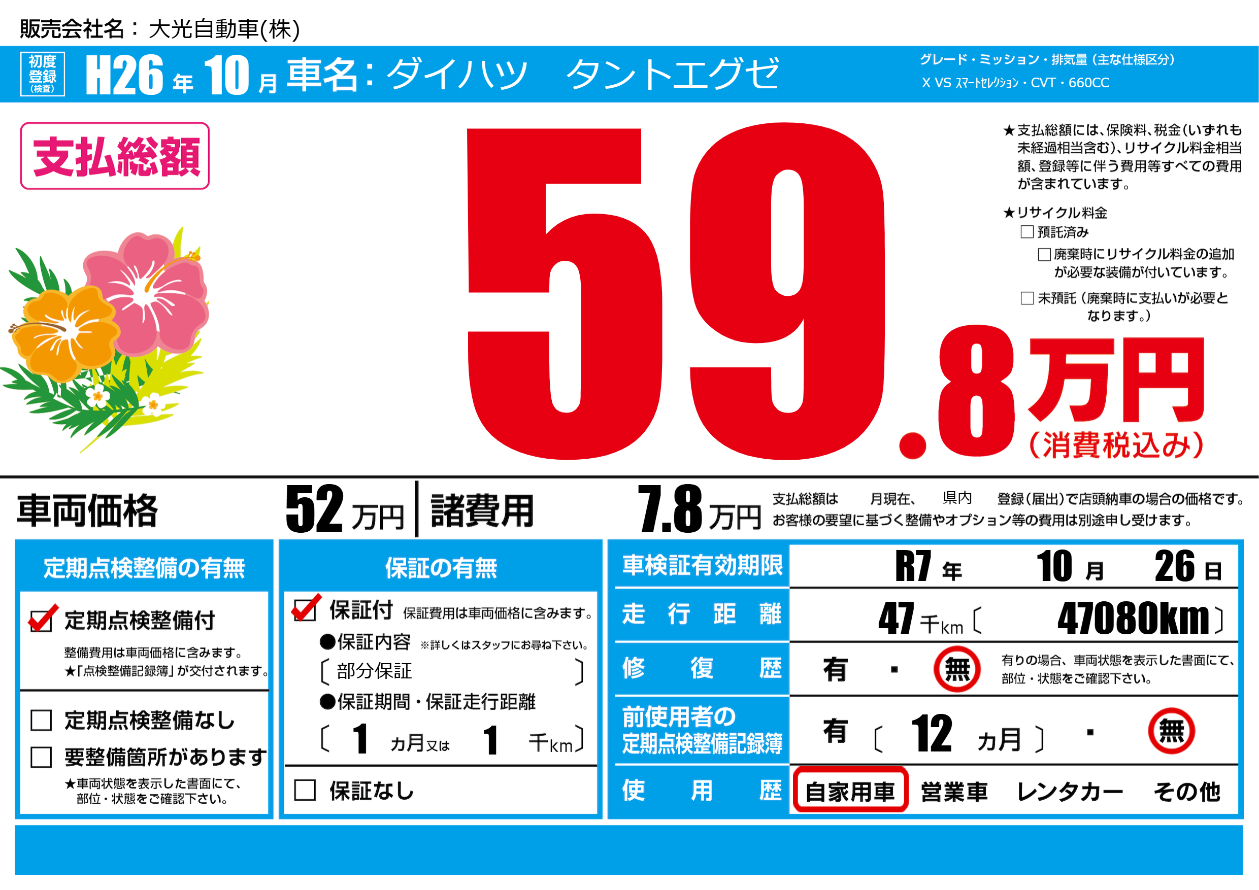 | 車名 | ダイハツ タントエグゼ | グレード ミッション 排気量 |