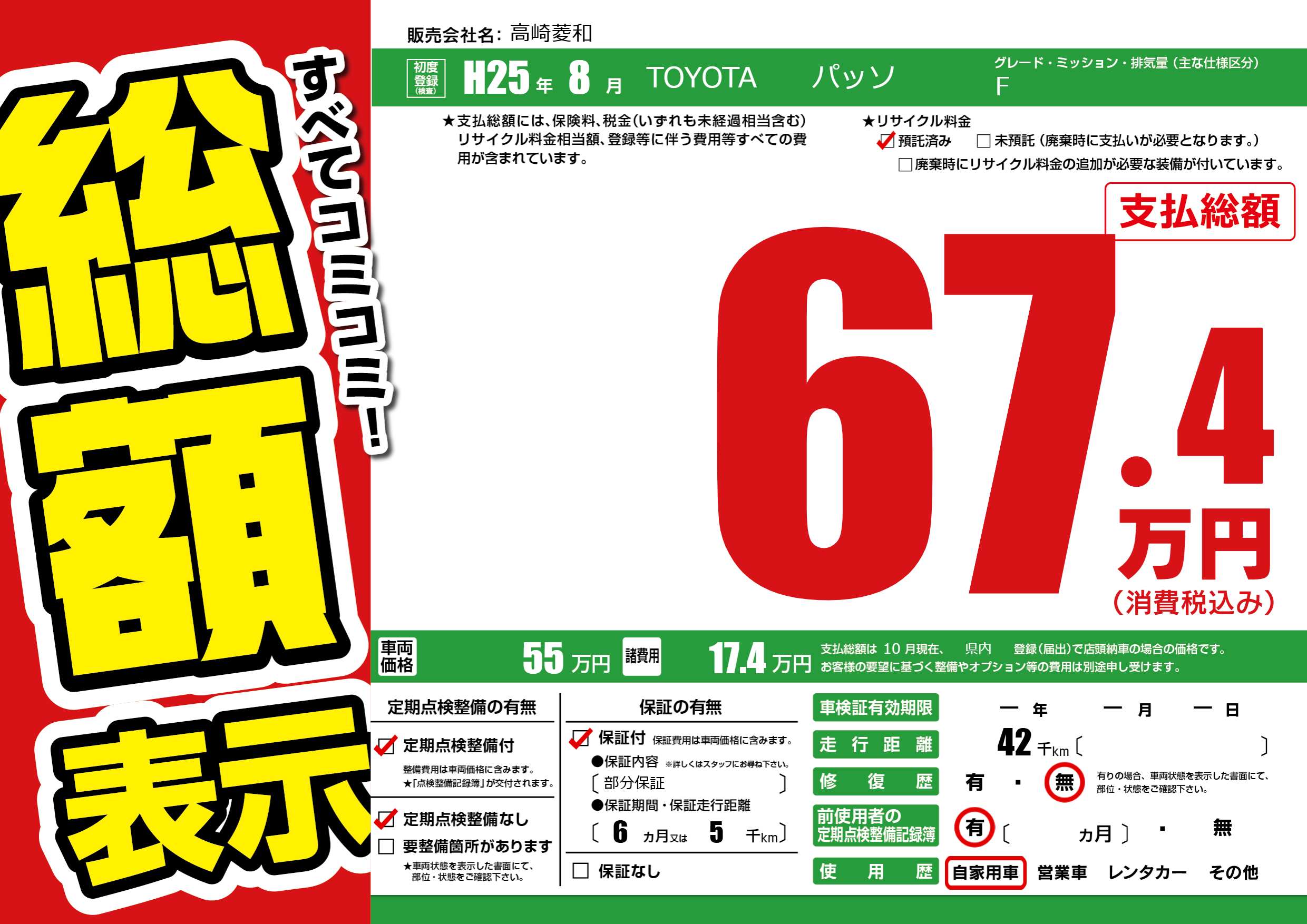 | 車名 | TOYOTA パッソ | グレード ミッション 排気量 |