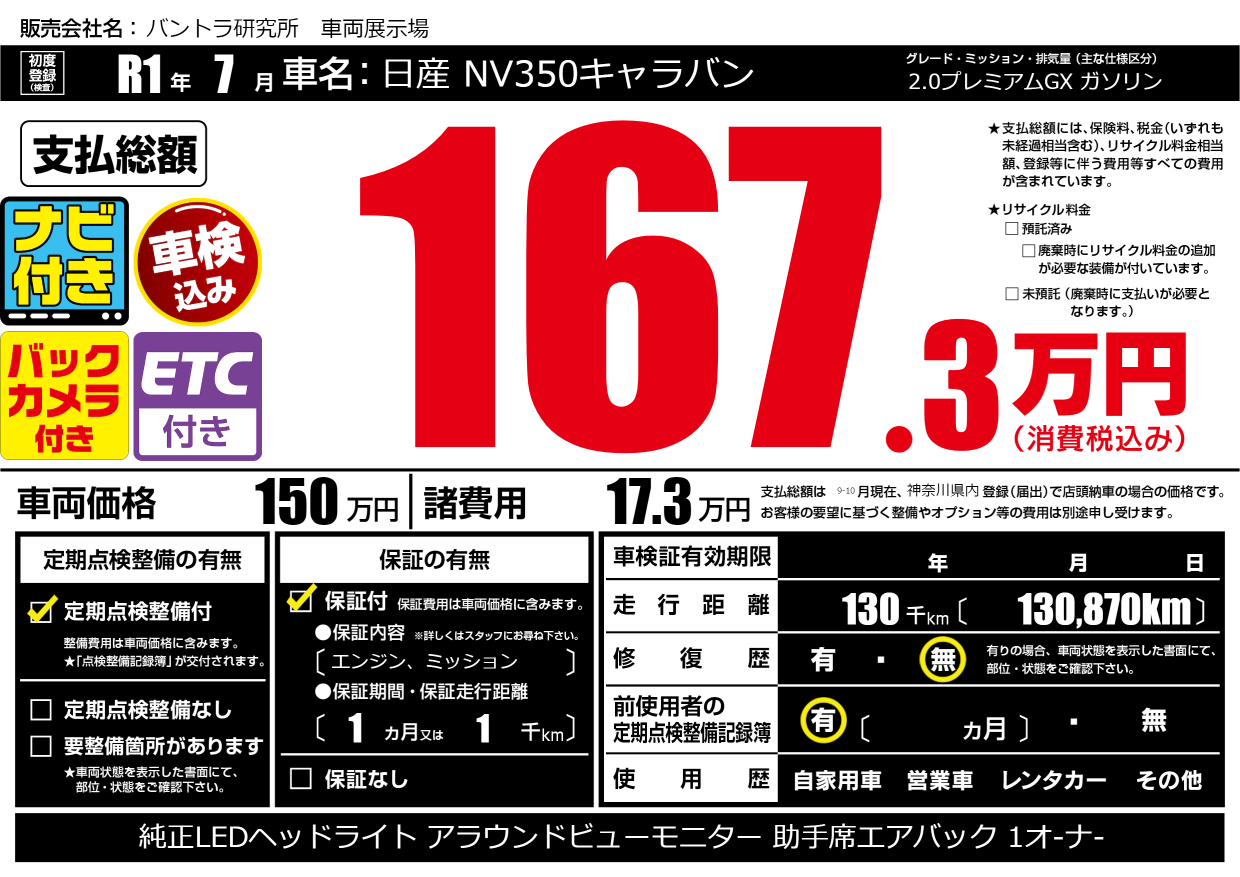 | 車名 | 日産 NV350キャラバン | グレード ミッション 排気量 |