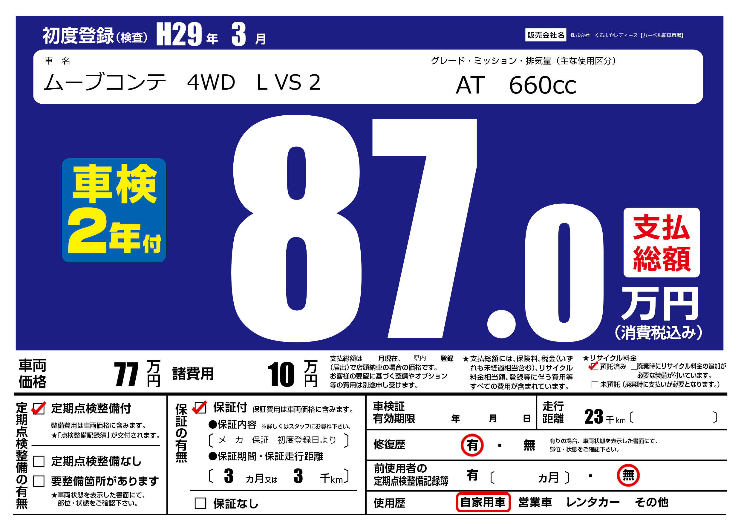 | 車名 | ムーブコンテ 4WD L VS 2 | グレード ミッション 排気量 |
