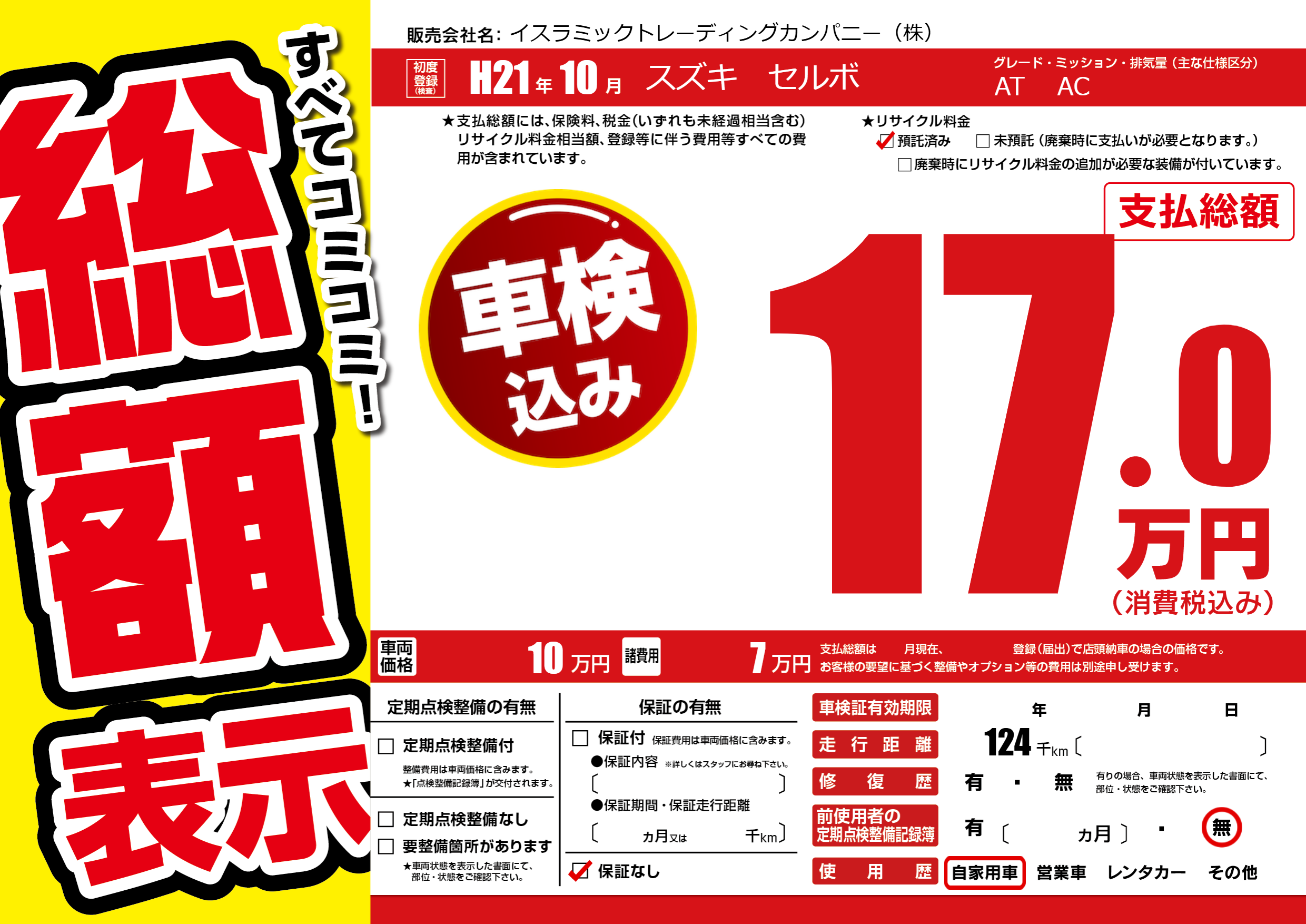 あり | リサイクル預託金相当額 | ( 0円)が別途必要 |