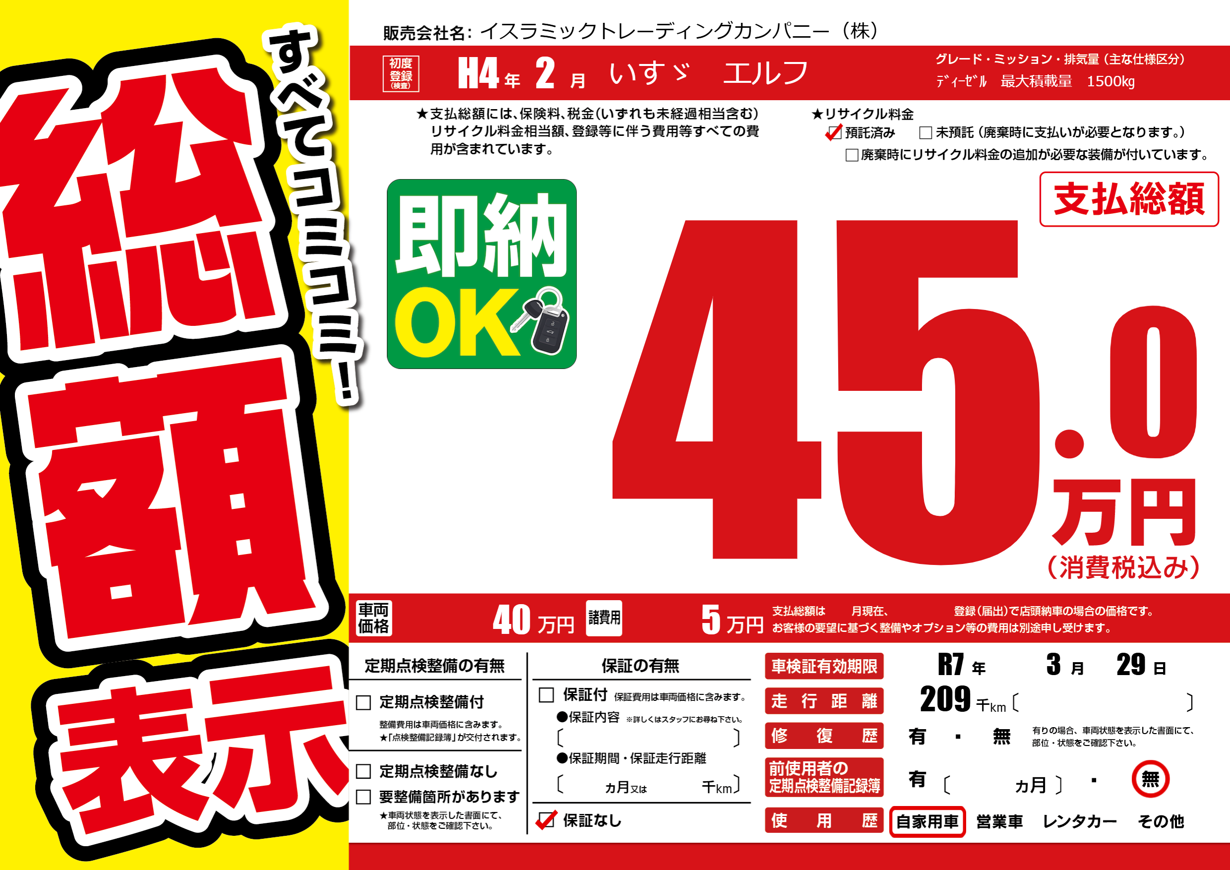 | 車名 | いすゞ エルフ | グレード ミッション 排気量 |