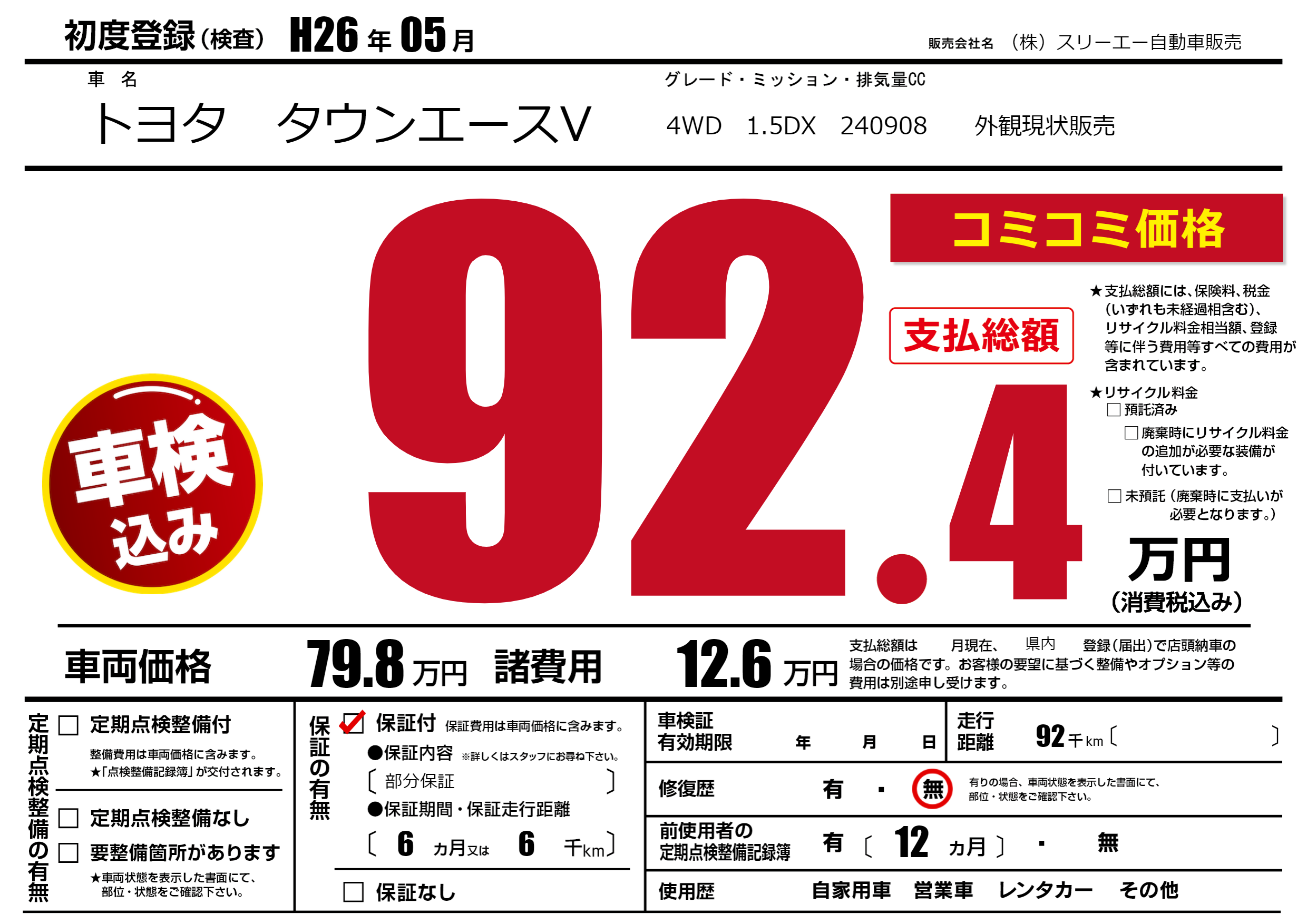 | 車名 | トヨタ タウンエースV | グレード ミッション 排気量 |