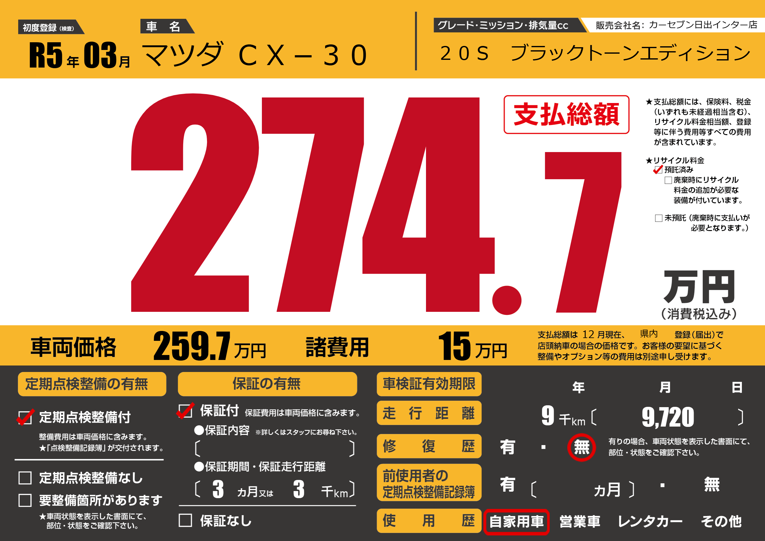 | 車名 | マツダ CX-30 | グレード ミッション 排気量 |