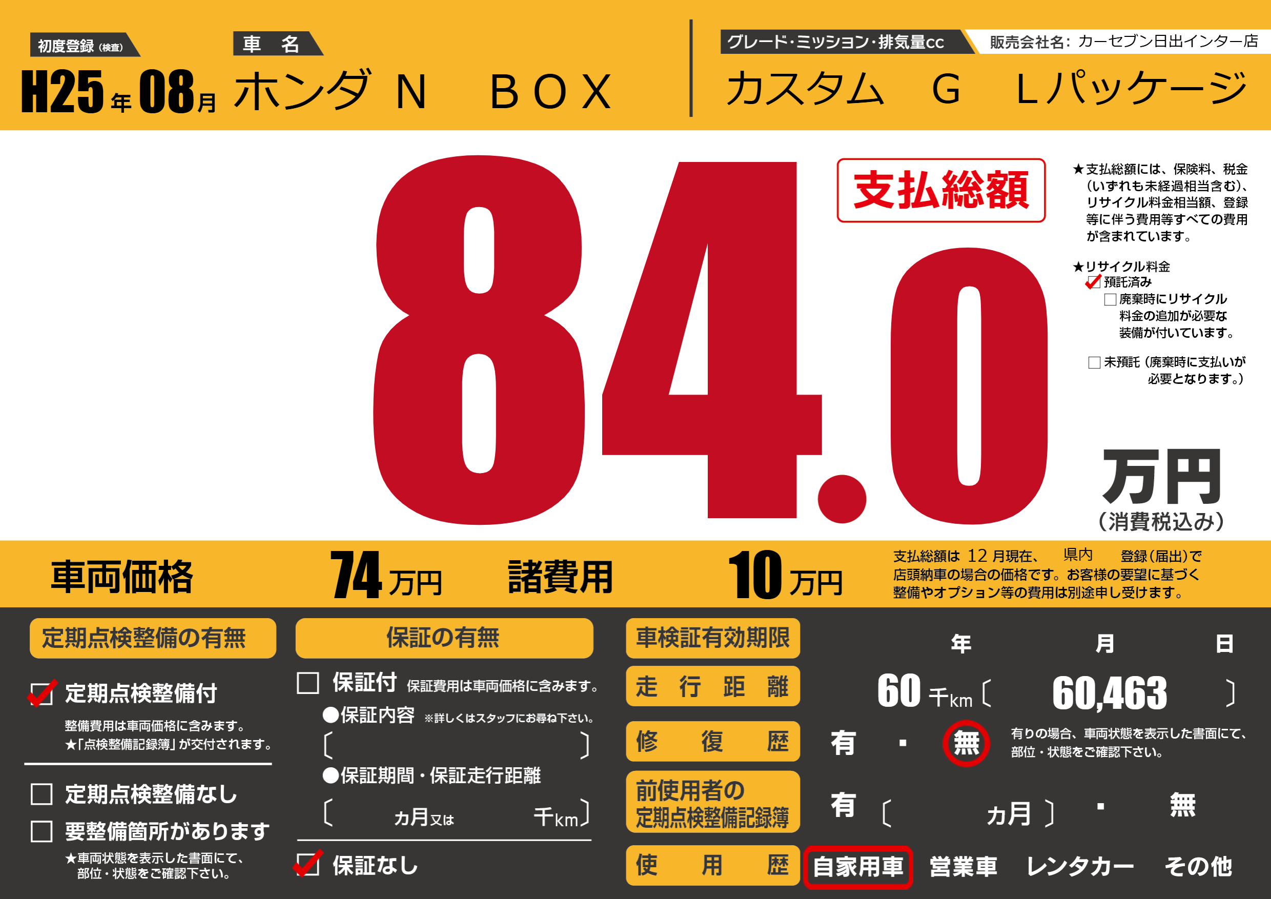 | 車名 | ホンダ N BOX | グレード ミッション 排気量 |