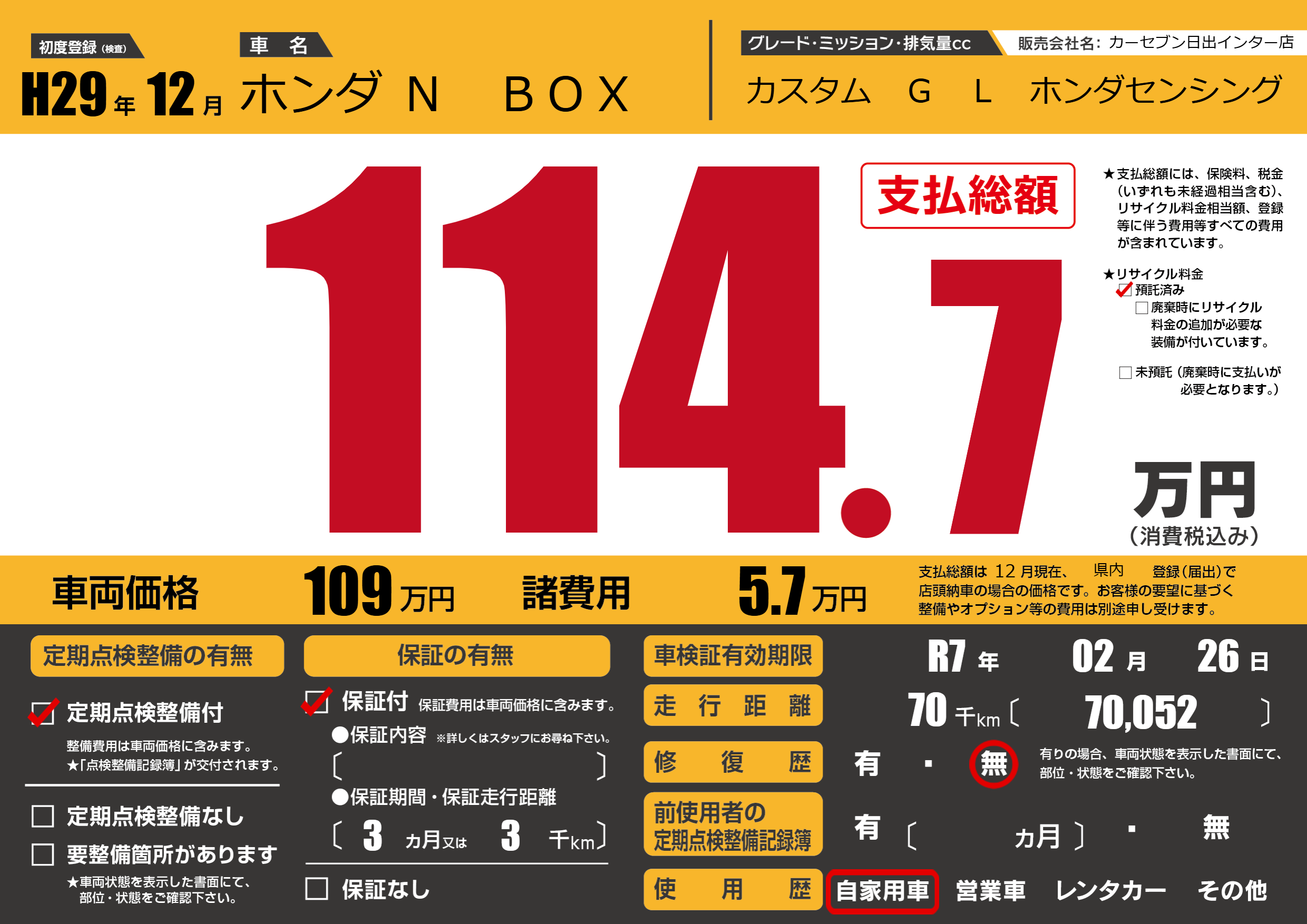 | 走行キロ | 7万km | 初年度登録 | H29年12月 |
