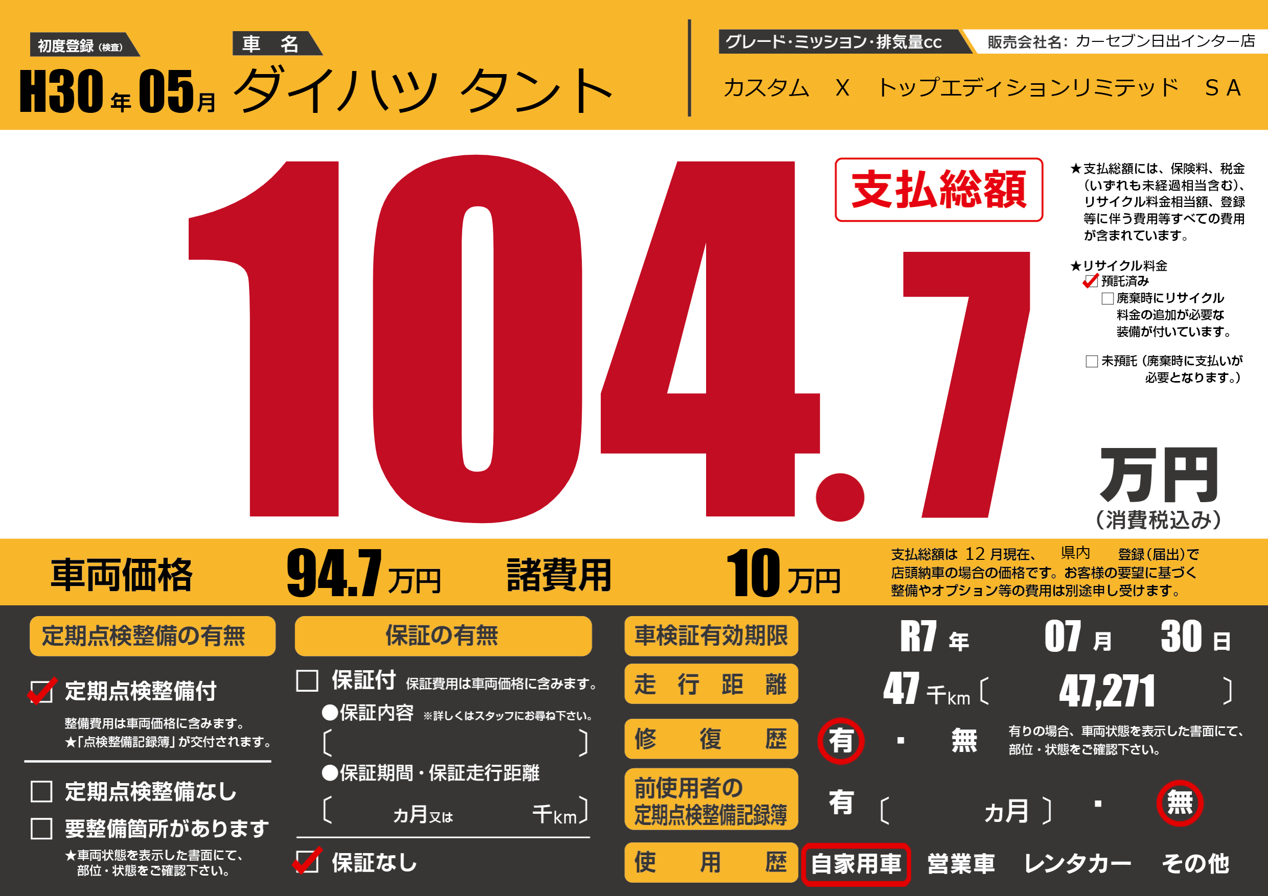 | 走行キロ | 4.7万km | 初年度登録 | H30年05月 |