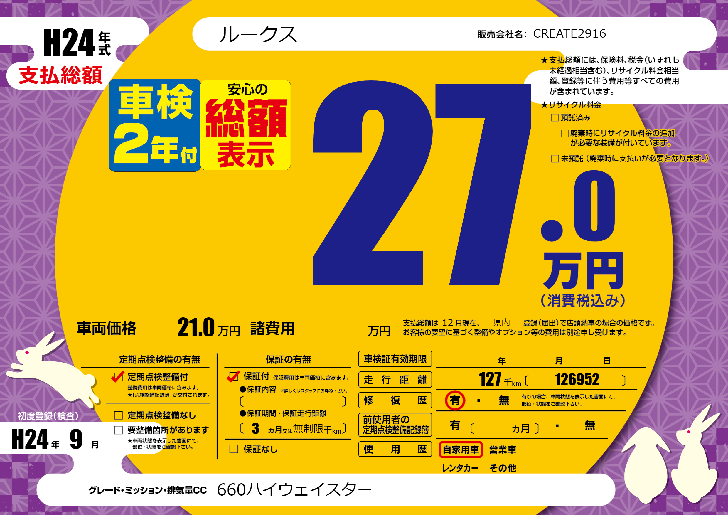 | 走行キロ | 12.7万km | 初年度登録 | H24年9月 |